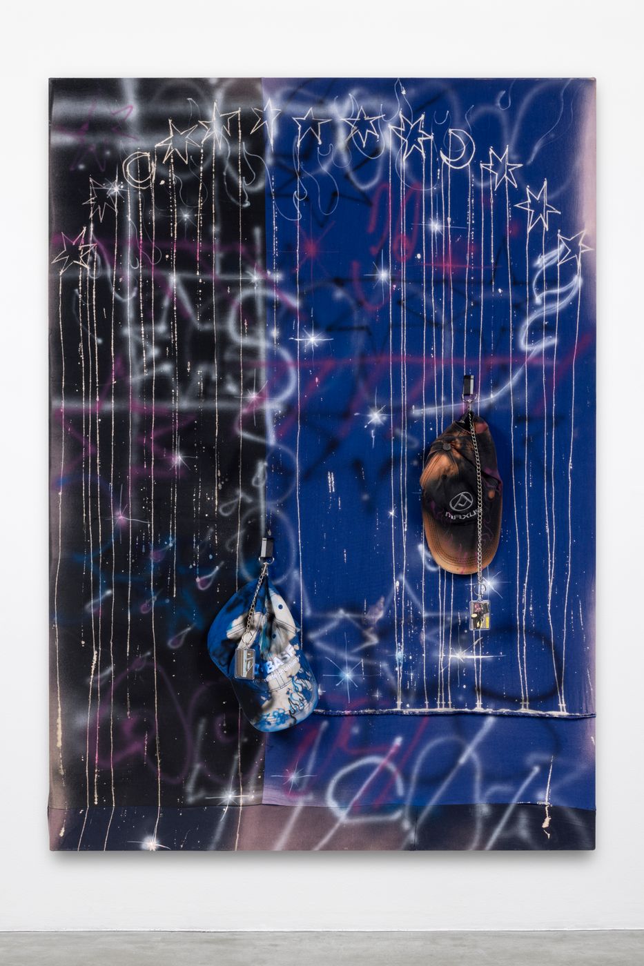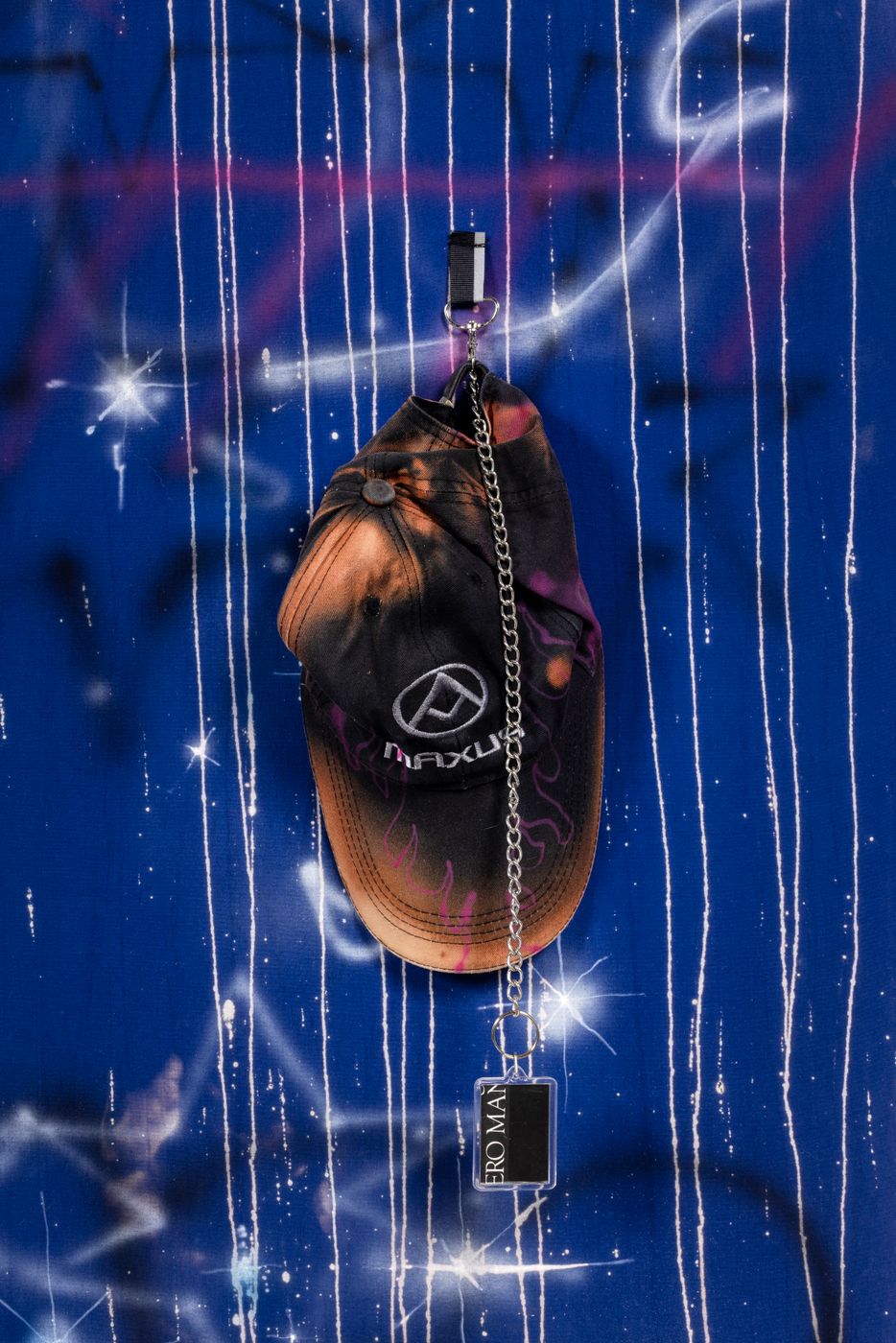 Airbrushing and bleach on cotton fabric, caps and keychains.