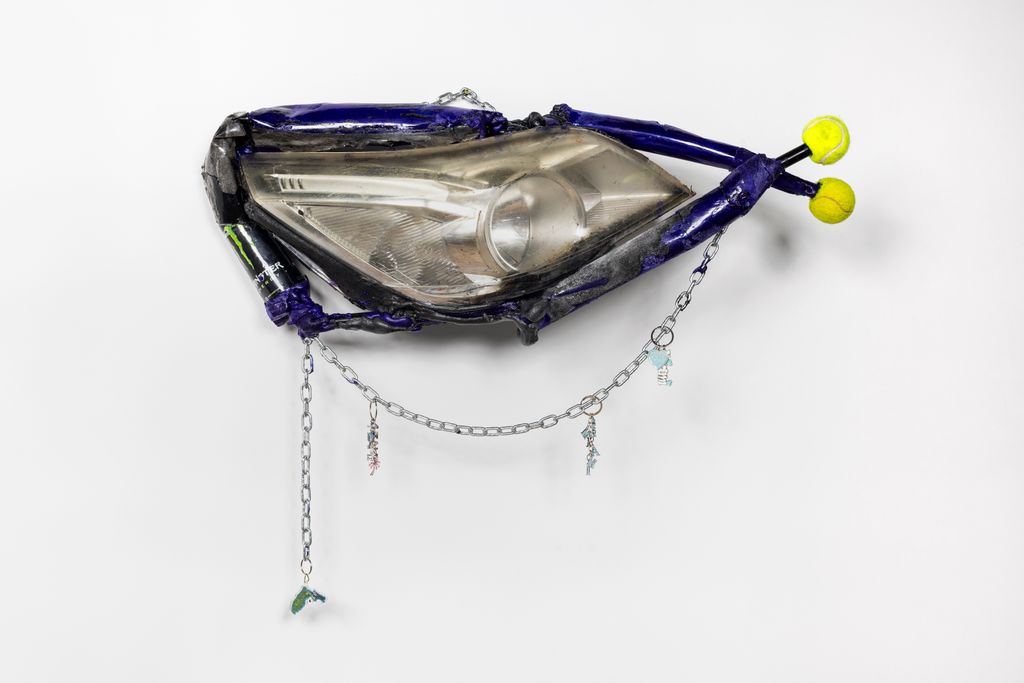 Car headlight, polyurethane foam, iron, chain, keychains, Monster bottle and tennis balls.