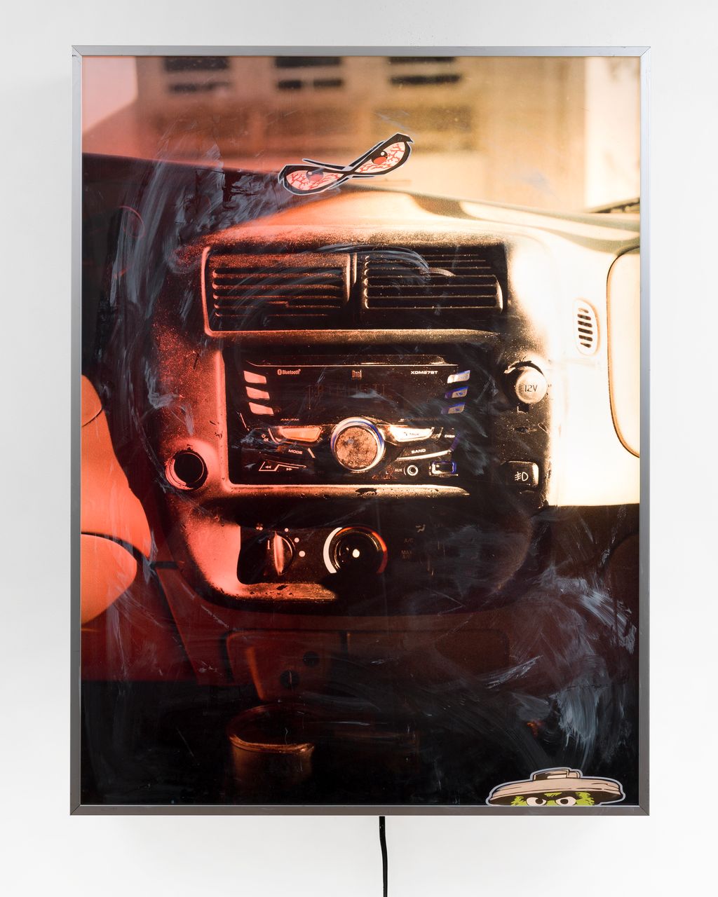 Lambda print, window paint,vinylcar decal in stainless steel lightbox with fluorescent bulbs