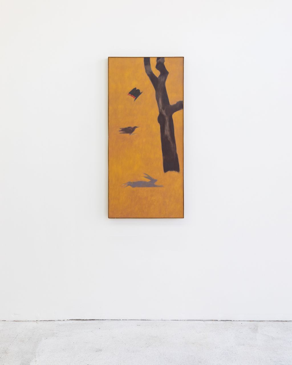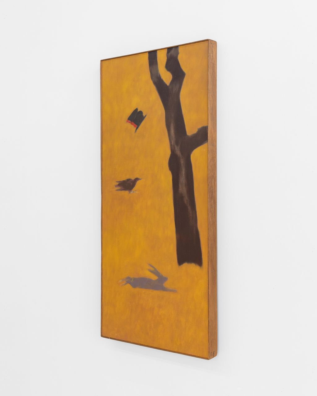 A single tree trunk and a few passing forms—a bird, its shadow, a rabbit in mid-leap—inhabit a shallow, golden field. The composition is notably compressed: depth is flattened, and the few visual elements press toward the surface, heightening the tension between stillness and motion. This compression invites close looking; each mark feels essential, pared down to the barest gesture.