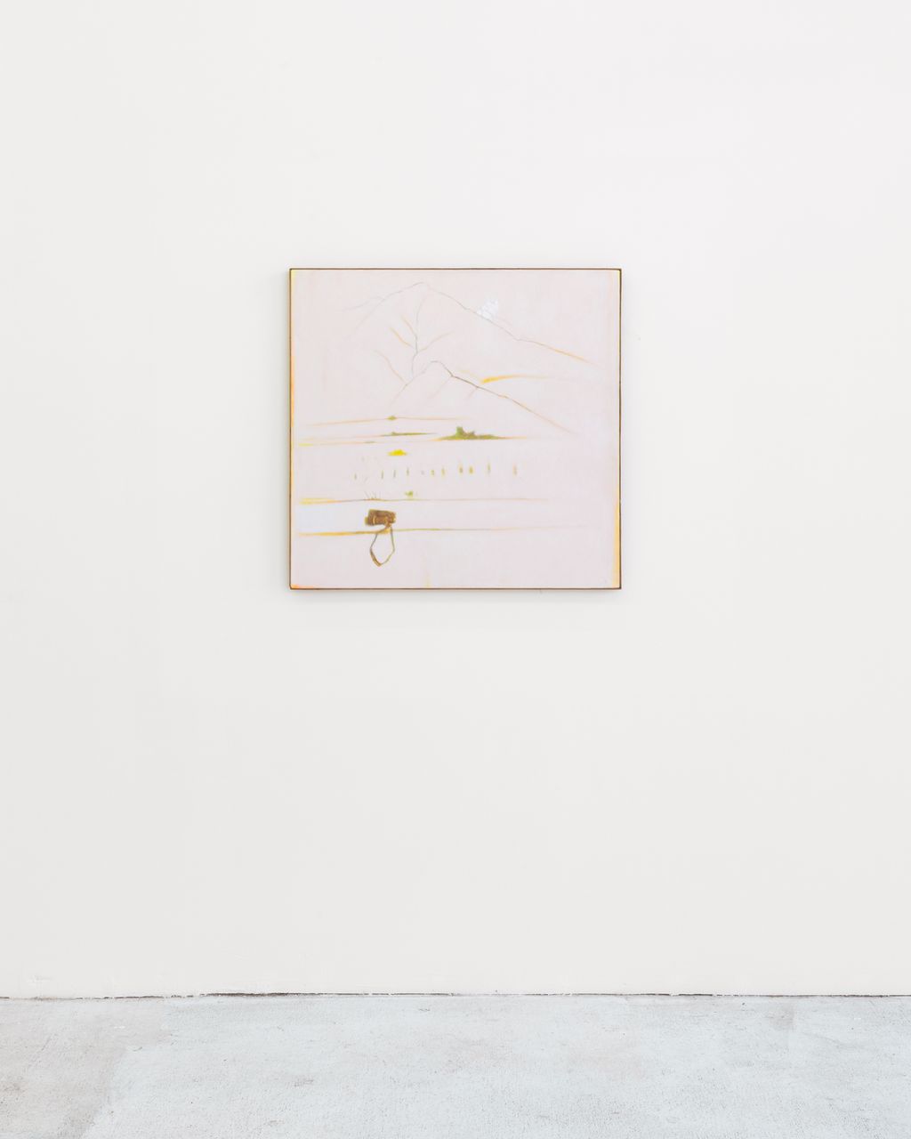 Here, the mountain is both subject and silence. Its presence is immense yet softened, rendered with the restraint of someone attuned to the invisible weight of air and time. The sparse marks—the trace of a fence, a small patch of green, the suggestion of a coiled rope in the foreground—anchor the painting to the physical world, while the open, nearly empty field of color invites inward reflection.