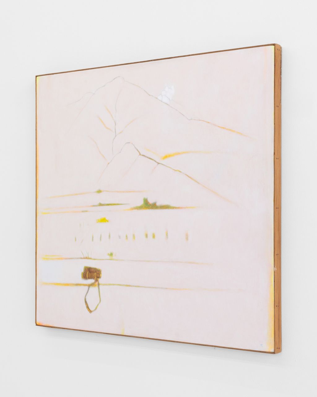 A faint line describes the horizon; above it, a mountain rises in gentle, dissolving contours. Reichman paints the landscape not as a view to be captured, but as an experience of stillness. The light, filtered through a veil of pale rose and ivory, feels almost inhaled—quiet and interior. The painting depicts the view from the porch of Luchita Hurtado and Lee Mullican’s home in Taos, a place long associated with artistic retreat and spiritual contemplation.