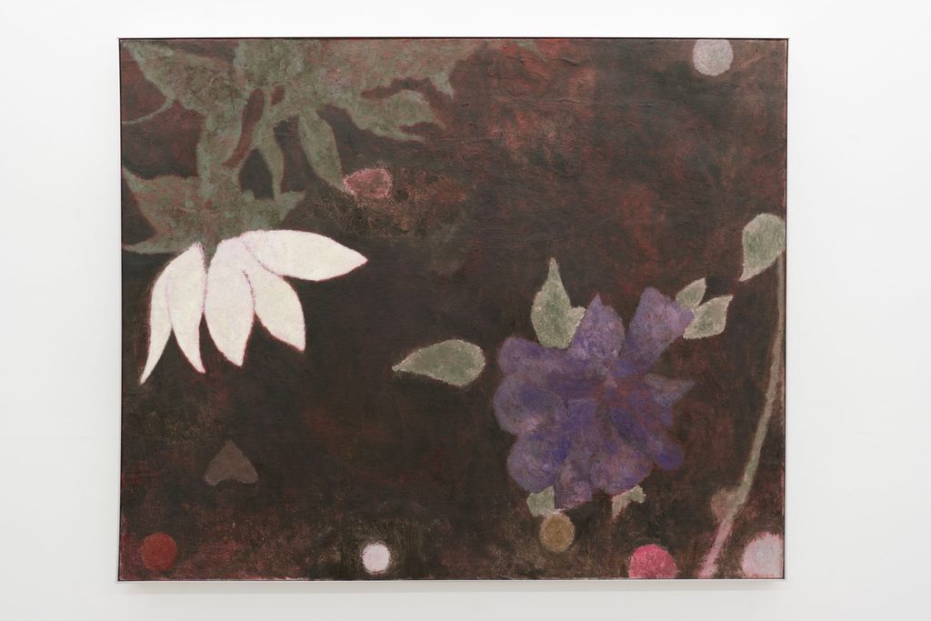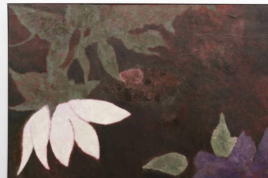 Ormsby’s touch is deliberate yet soft, his colors built through layers of muted violets, browns, and greens that dissolve into one another like remembered forms. The petals are less painted than revealed—edges blurred, their outlines fading into shadow. There’s a sense of both emergence and decay, as if the flowers hover between full bloom and dissolution.