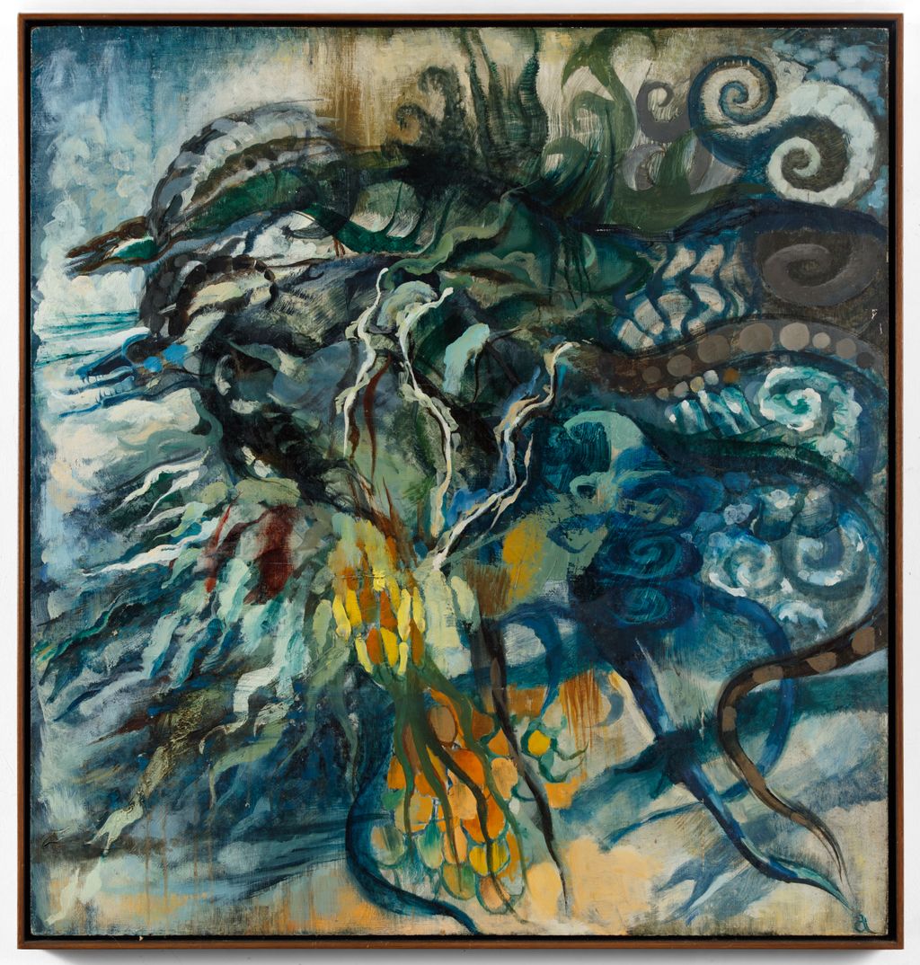In Blue Racers, Ariel Parkinson fuses myth and movement into a single, fluid image. The composition feels almost stage-like—an unfolding drama of coiling forms and shifting light, where sea and sky, plant and creature seem to merge. The painting’s surface churns with motion: spiraling blues, serpentine tendrils, and bursts of yellow and green evoke both natural energy and the symbolic gestures of mythic storytelling.
