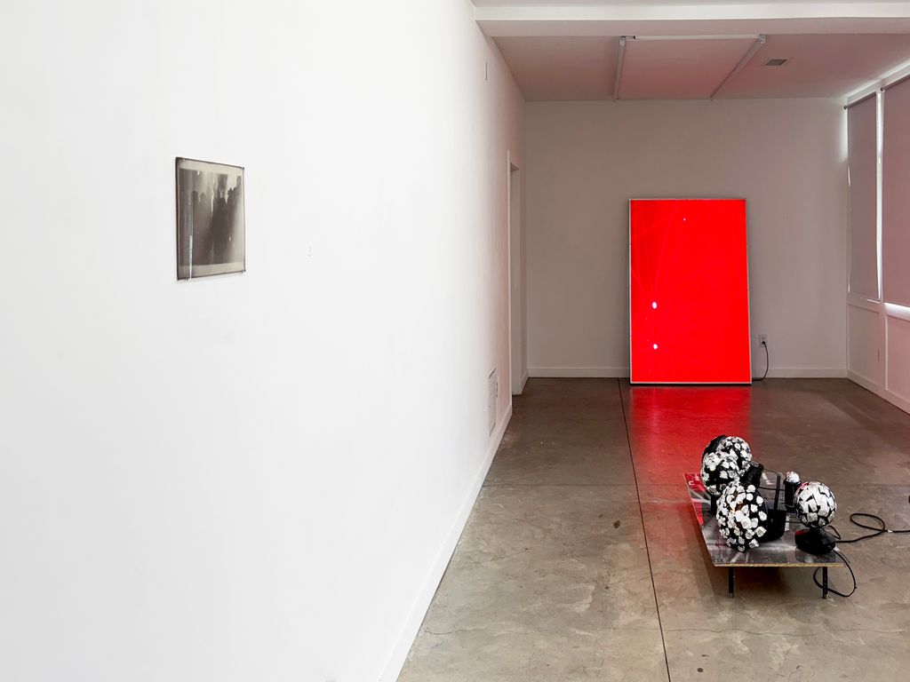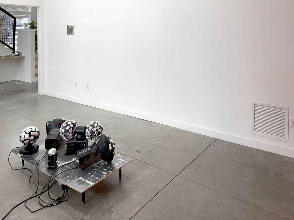 Five spinning disco lights, aluminum tape, engineer print, silver gelatin prints, and acrylic on artist's pedestal.