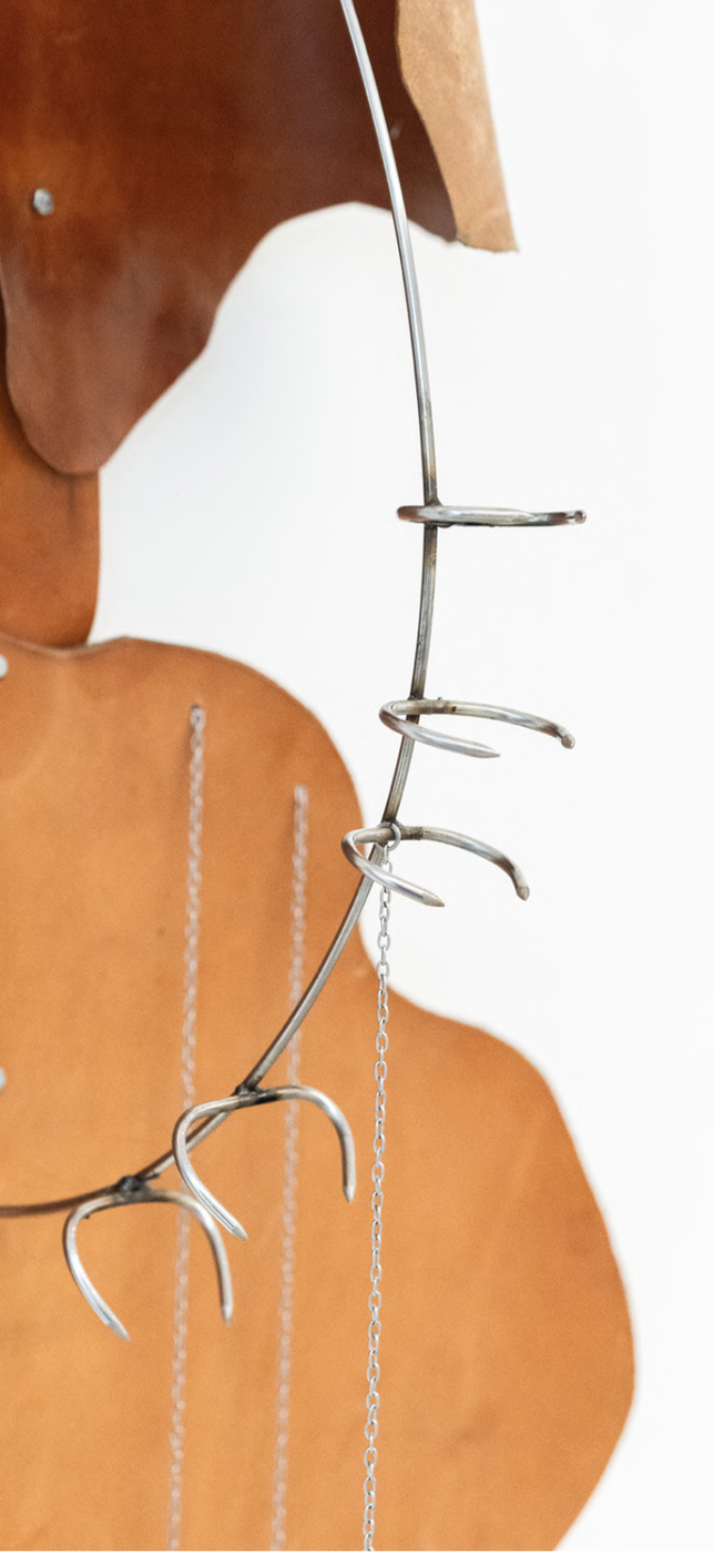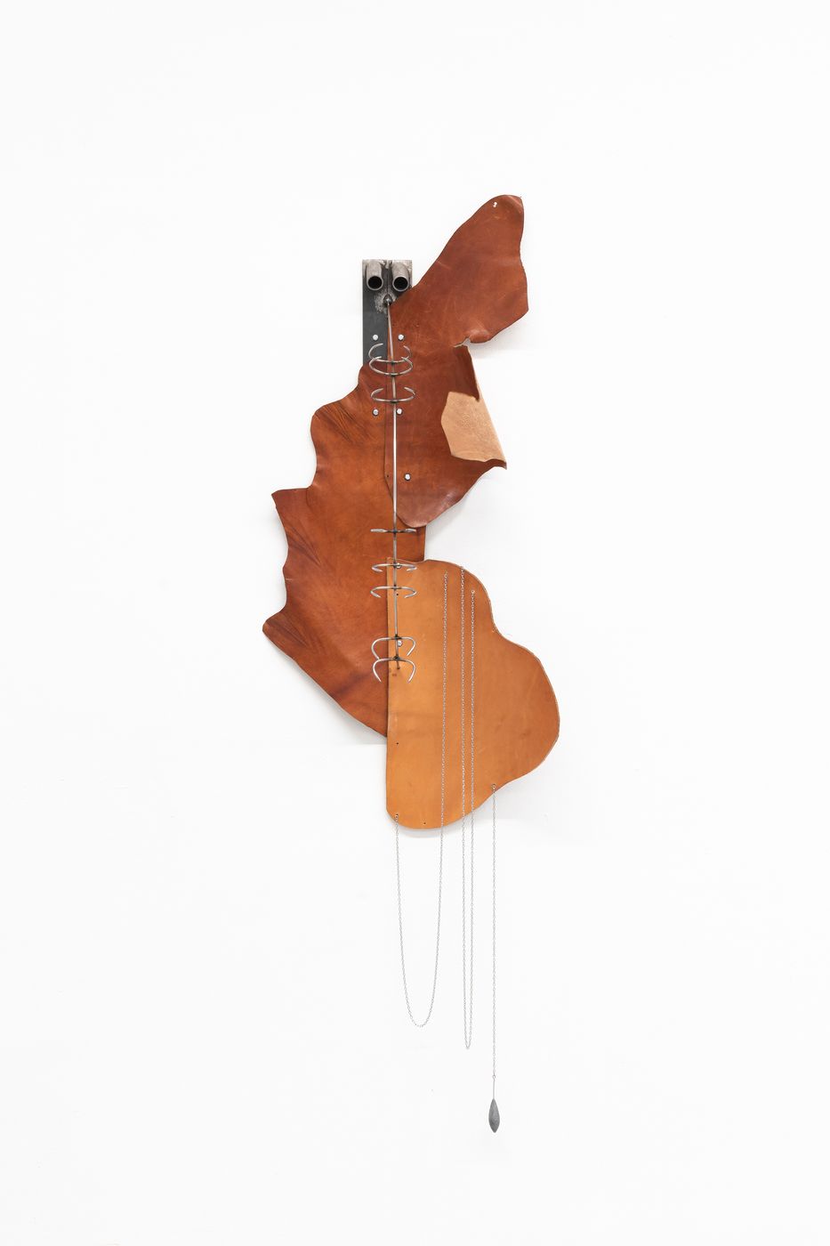 This sculpture is built from fragments of leather, latex, and other materials symbolically linked to the body. Reorganized and assembled with metal structures, these elements form a shape that recalls the human body, but also other possible organisms— hybrid, ambiguous, unclassifiable. The piece proposes a transformed, post-body—where the mix of textures—soft, hard, organic, industrial—gives rise to a new kind of corporeal identity. A physical presence that does not aim to represent, but to suggest: what comes after the body as we know it.
