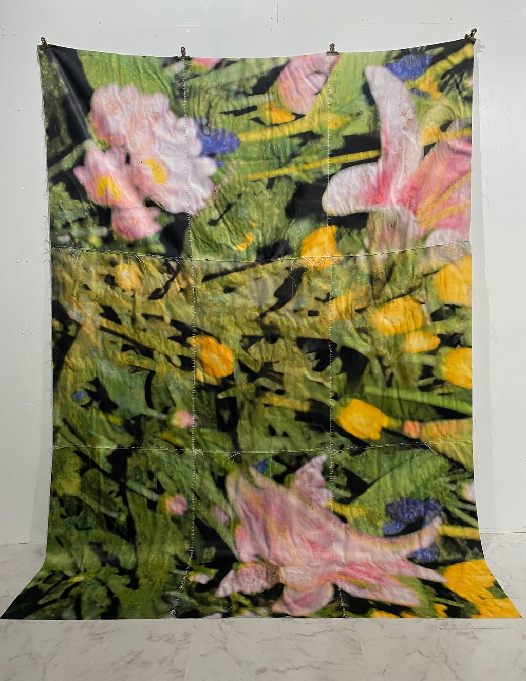 Photographs printed on paper were buried in soil, and the transformed images were reprinted on fabric and sewn together