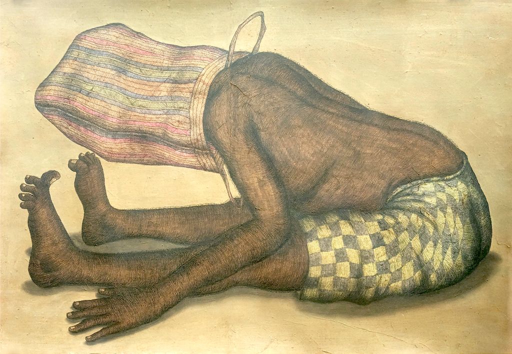Avijit Dutta's imagery captures the complex world of factory labor, where survival itself becomes a daily negotiation. Faceless figures, often hidden within 'thongas' or nylon sacks, speak to the anonymity and identity crisis of industrial workers whose individuality is absorbed into the machinery of production. By concealing the workers’ faces, Avijit does not erase them but exposes the systemic forces that obscure their humanity. Through surreal yet grounded depictions, he portrays a community that finds fleeting humor, solidarity, and dignity amid hardship. His ongoing engagement with Howrah’s industrial hubs—its railway yards, foundries, and iron workshops—reveals a deep empathy for the people who inhabit them. Ultimately, his work stands as a tribute to the common man: a meditation on labor, survival, and the unyielding fight for existence that defines the human condition.