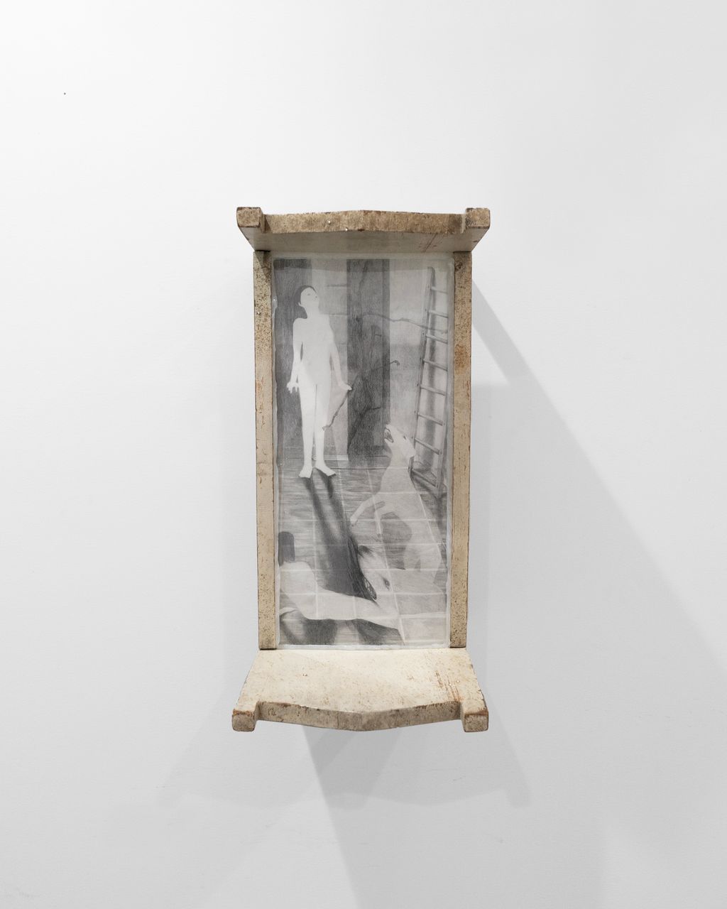 Graphite on vellum, acrylic, silicone, assorted metal, doll’s bed frame