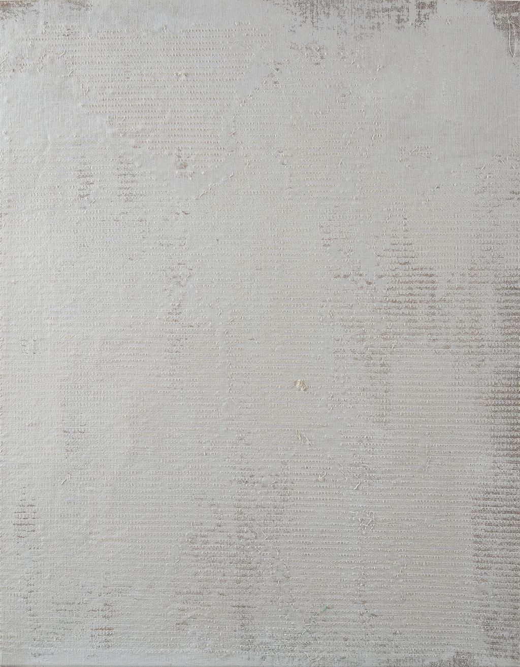 The "Monotony of the Pattern Recognizer" series of 2021 - machine embroidery, algorithmic text, acrylic on canvases - extends Zhilyaev’s use of white monochromes to question institutions and frame white as action and renewal.