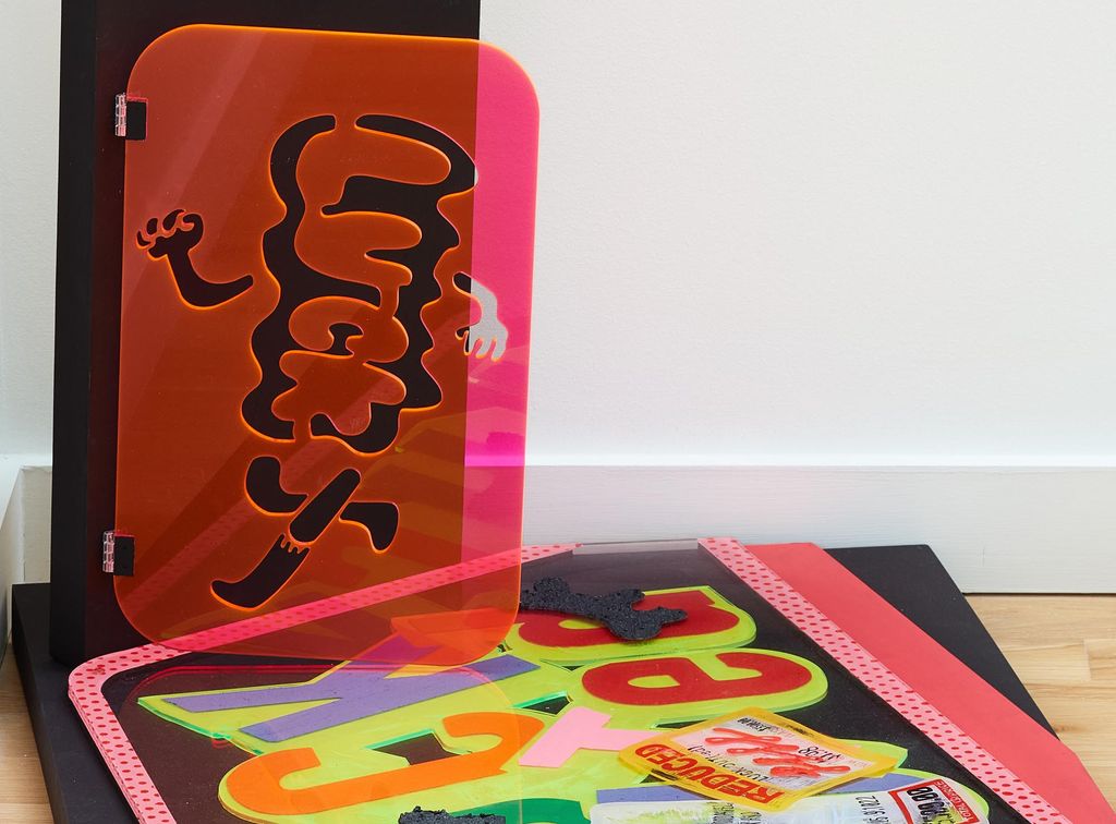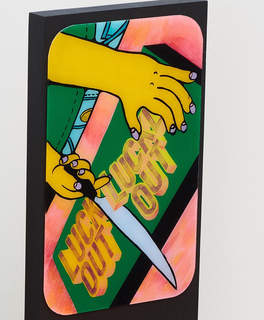 Two-paneled, sculptural painting, presented on the floor, with one panel flat on floor and the second panel rests perpendicularly atop. The top panel has an orange laser cut plexi sheet hinged to it and painting on plexiglass depicting a pair of hands slicing the words "luck out" on a kitchen cutting board. The bottom panel is a painting of the word "luck" in bright colors, rendered a la a mid-century era road sign, with tromp-l'oeil renderings of receipts superimposed over the text.