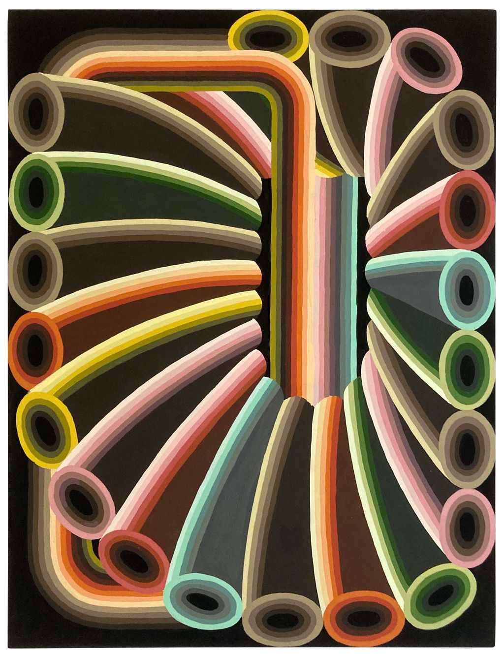 Small painting on panel with abstract shell-like patterns set off by careful line gradients that create a neon glow from afar. Neon yellow and magenta but also taupe and coral, muddier colors that nonetheless seem luminescent — is set off by black areas that suck in the light. Fake carefully stripes the edges of his panels, makes the paintings feel like artifacts from a glamorous vintage casino. His earlier work explored architecture as a way of expressing trans identity; these panels carry that forward, articulating a queer space without reference to location.