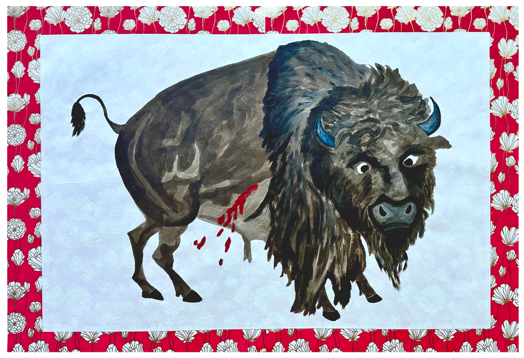 Wendy Red Star works across disciplines to investigate and reimagine historical tropes of Indigenous representation. Her “Bison” paintings depict wounded bison based on American painter George Catlin’s depictions of bison from the 19th century.
