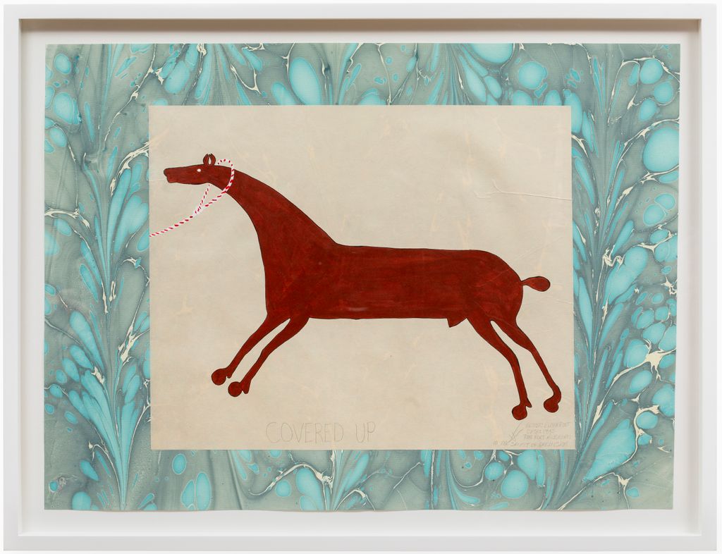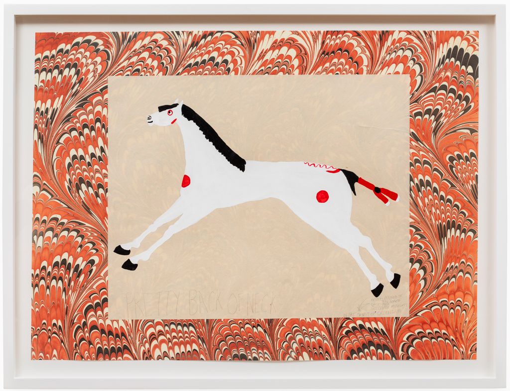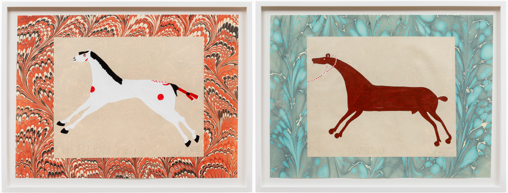 Wendy Red Star works across disciplines to investigate and reimagine historical tropes of Indigenous representation. In her ongoing series of horse paintings, Red Star recreates horses from historical ledger drawings made by Plains tribes, claiming each horse as her own in the tradition of “horse getting.” This work is a diptych of two original paintings, mounted on marbled paper, framed.