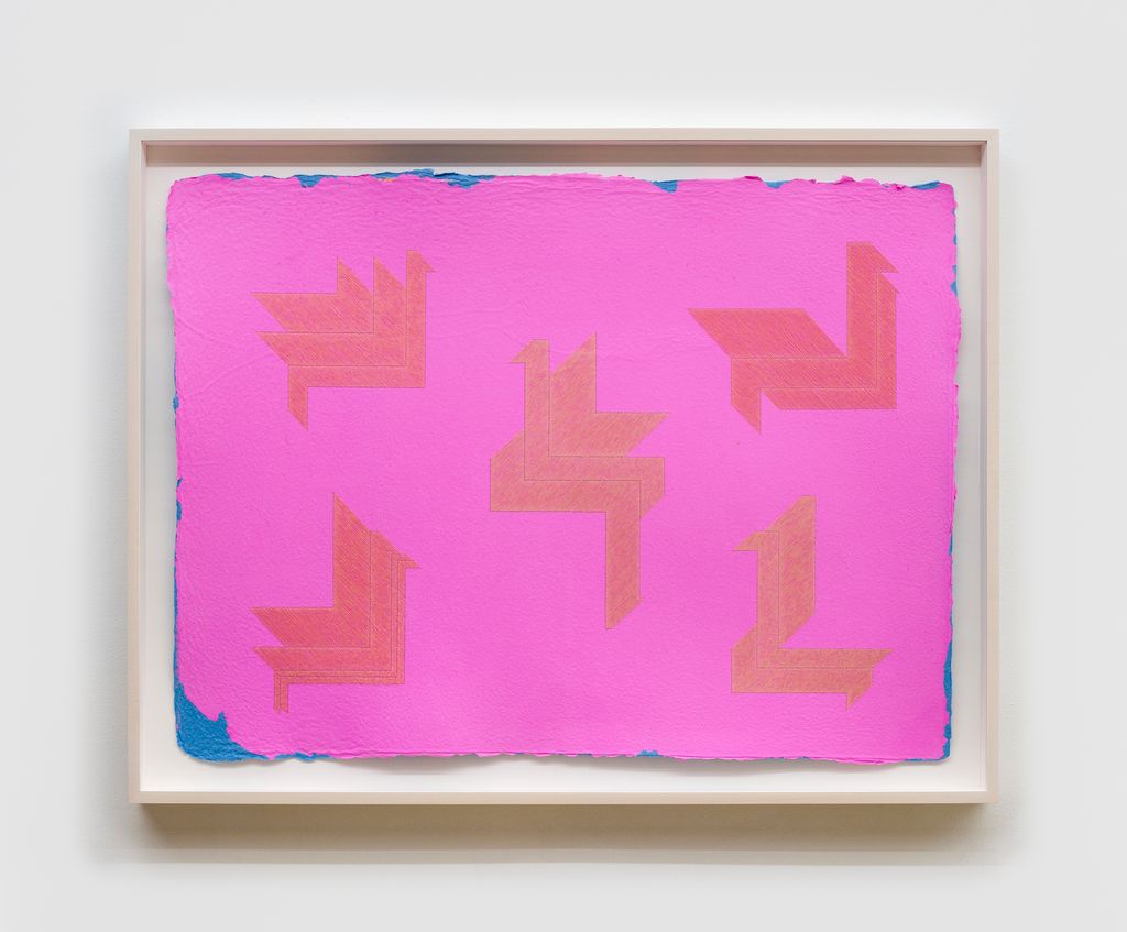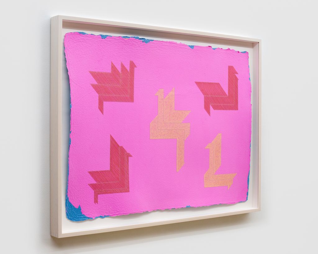 Using both 24-karat gold thread and common sewing thread, Aminlari hand-stitches directly into handmade or hand-painted paper to achieve a variety of visual effects. Influenced by architecture and the geometric structures of Persian carpets, these works function as discrete investigations of scale, light, and color. Aminlari’s practice is also deeply concerned with labor and the fundamental process of repetition inherent in the act of sewing.