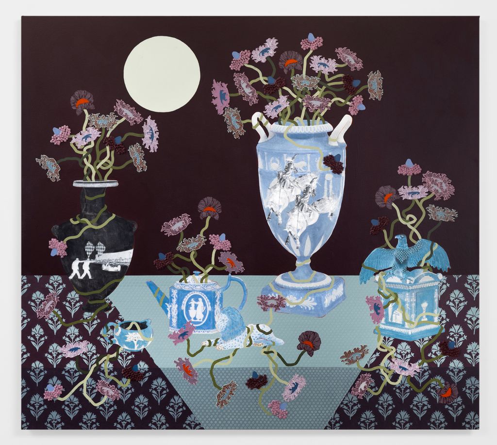 Lizzie Gill explores themes of domesticity through elegant tablescapes which feature a menagerie of porcelain animals and antique ceramic wares. For Gill, these conversation pieces are the anchor point for a larger discourse about the continuity of history, generational knowledge, and allegorical symbolisms. Formally, Gill’s paintings are textured—using cake piping techniques to render the surface—exuberant and densely packed with symbolism.
