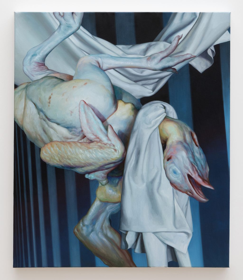 Xiao Wang paints hyper-realistic tableaus of social gatherings, sumptuous still lifes, and joyful immersive dream-like scenes. Featuring lush foliage, overflowing fruit plates and carefully rendered personal objects, Wang extends an intimate, if a bit voyeuristic, access into the artist’s private universe. The historical format of the vanitas painting also serves as a key reference point for Wang, who is keenly aware of the still life’s ability to communicate wealth and abundance and their impermanence.