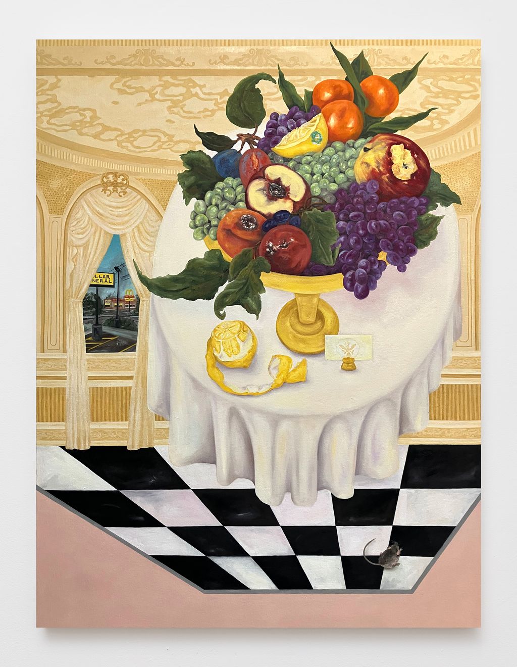 Katie Butler’s allegorical still life paintings provide critical commentary on the financial disparities in American society. Butler’s paintings are rich with humor and tongue-in-cheek social commentary. Weaving recognizable elements of American visual culture–such as the picnic and the familiar checkered floors of a classic diner–surrounding her tables piled high with food. Butler creates tableaus that seem celebratory at first but, upon closer inspection, reveal themselves to be riddled with flies, rats, mold, and other clues pointing towards corruption.