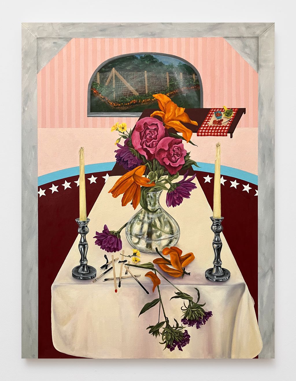 Katie Butler’s allegorical still life paintings provide critical commentary on the financial disparities in American society. Butler’s paintings are rich with humor and tongue-in-cheek social commentary. Weaving recognizable elements of American visual culture–such as the picnic and the familiar checkered floors of a classic diner–surrounding her tables piled high with food. Butler creates tableaus that seem celebratory at first but, upon closer inspection, reveal themselves to be riddled with flies, rats, mold, and other clues pointing towards corruption.