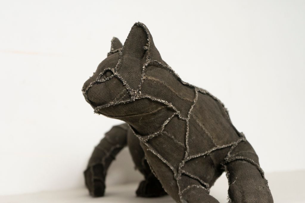 Thus, the series proposes a reading in which the seemingly tender becomes unsettling and the familiar acquires a disturbing depth. Some of these pieces were also conceived as self-portraits: the artist incorporates fragments of his own clothing to cover the sculptures, inscribing his body and memory into the work. This gesture turns the cat-sculptures into an intimate space where personal vulnerability and collective tensions intersect, reminding us that beneath the layers of domestication—social and personal—our instincts and impulses persist.