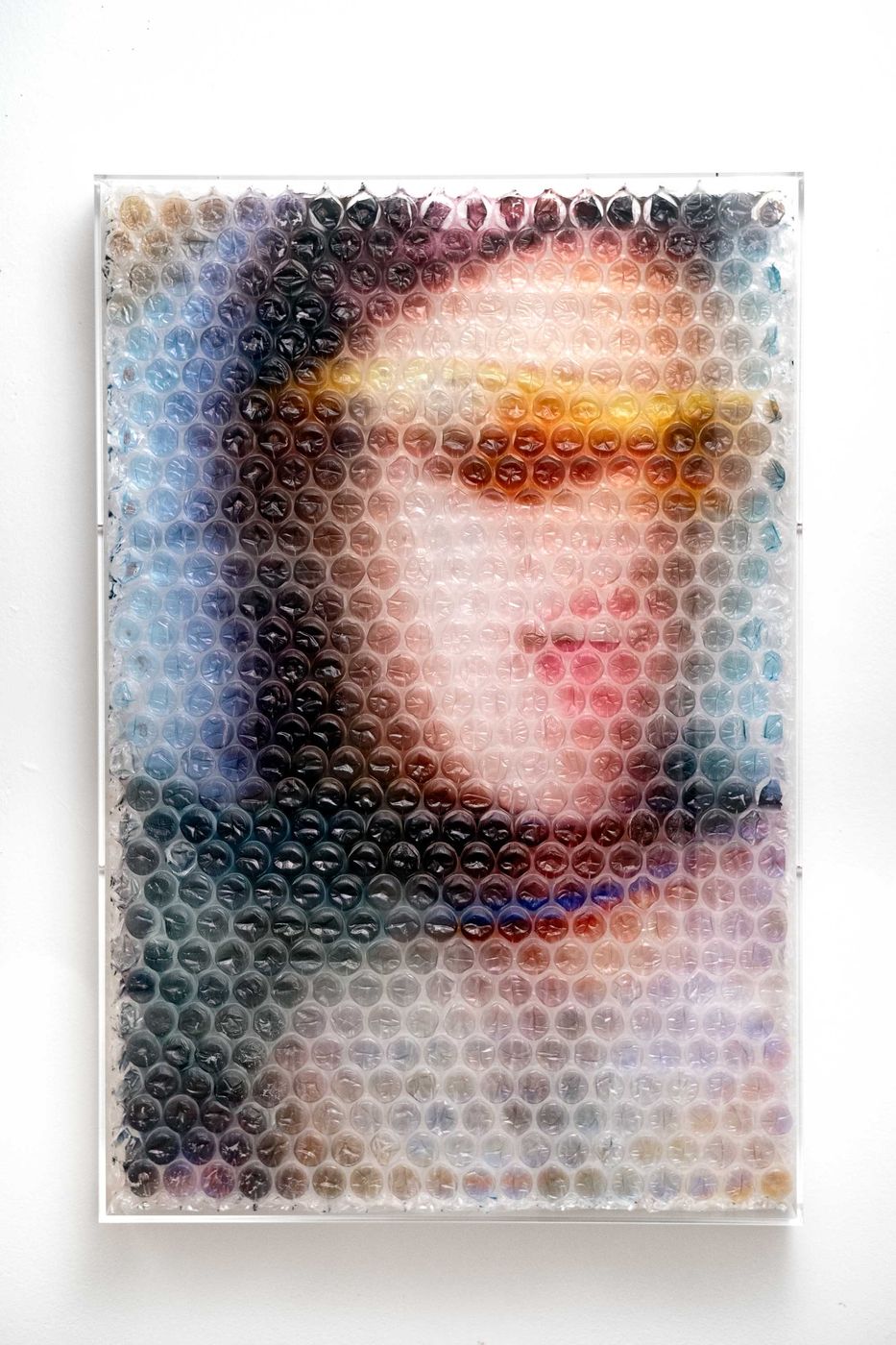 UV printed photograph on bubble wrap, framed in clear plexiglass lid with canvas backing