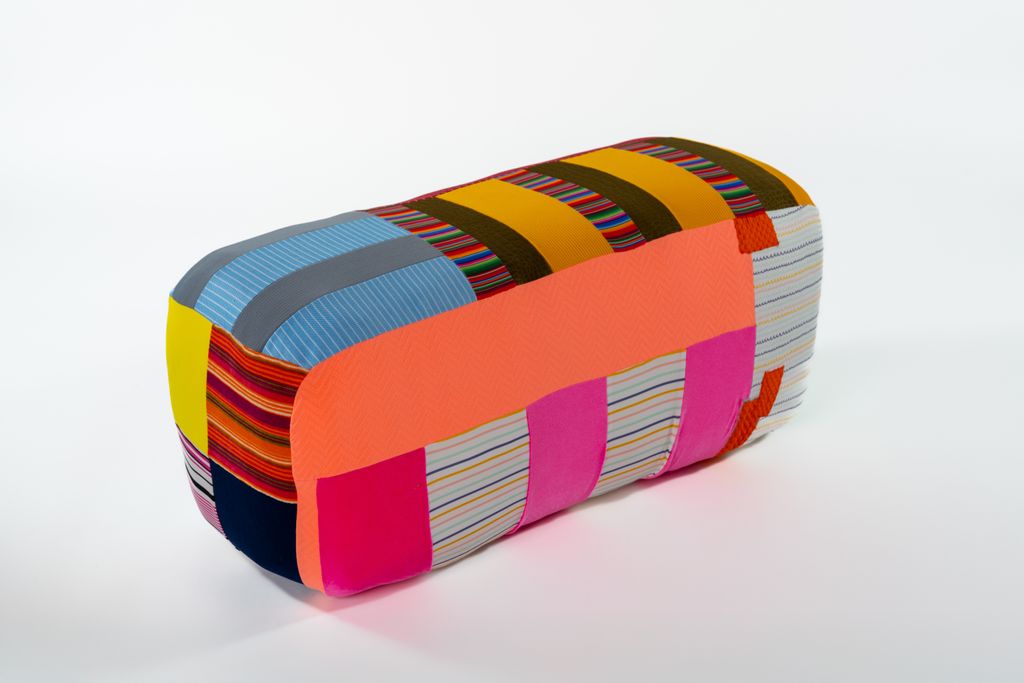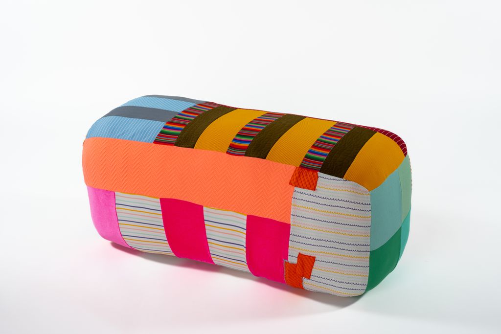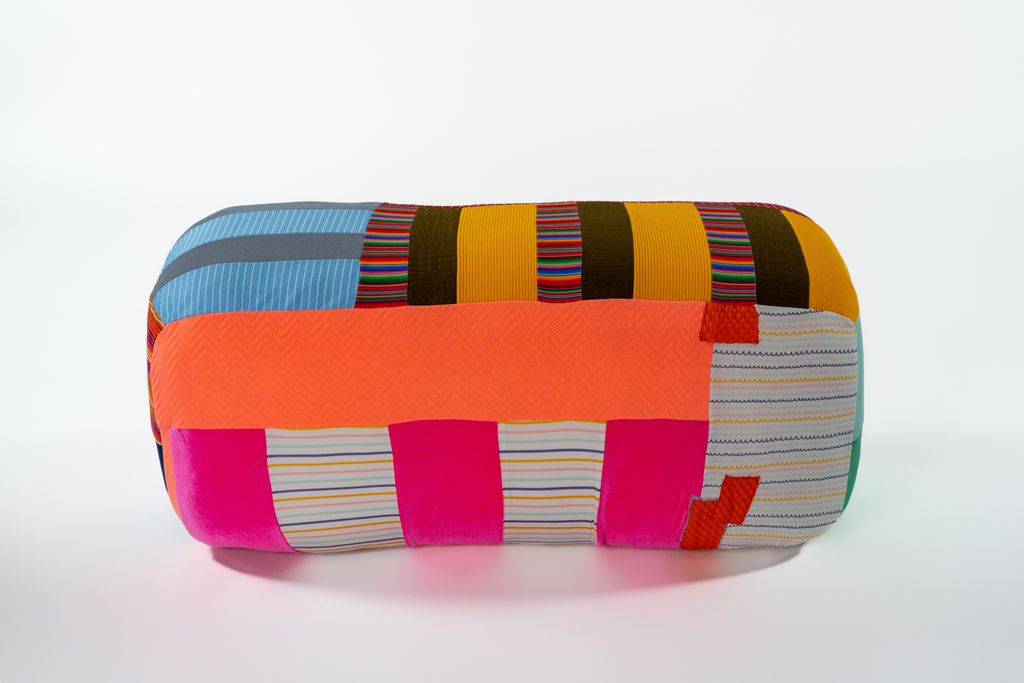Andy Coolquitt, A nice, soft place for meeting people, 2025Fabric, cotton stuffing, wood16 × 36 × 16 inches