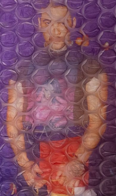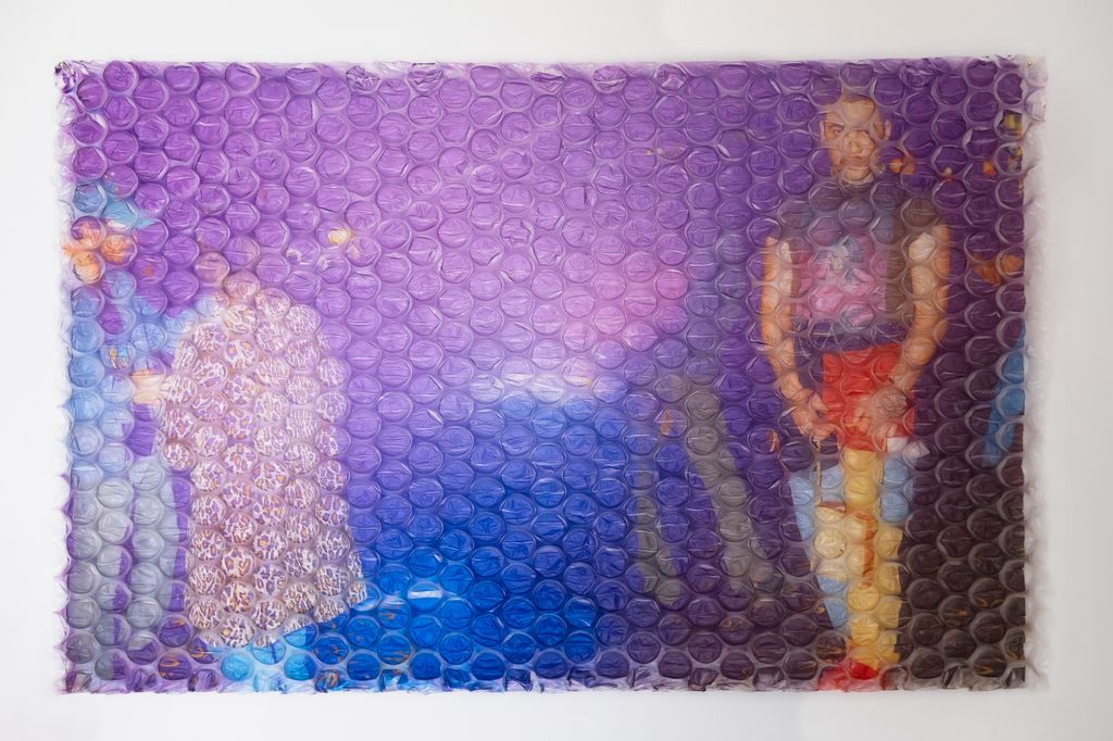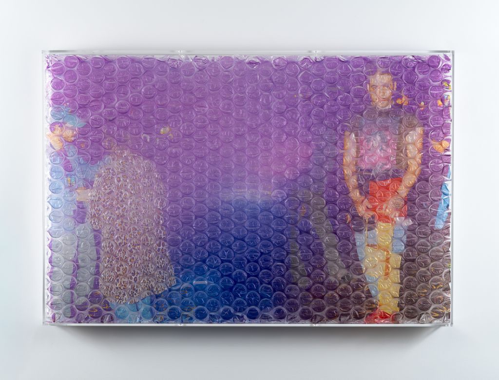 UV printed photograph on bubble wrap, framed in clear plexiglass lid with canvas backing