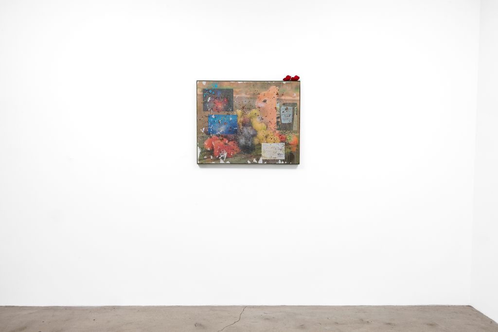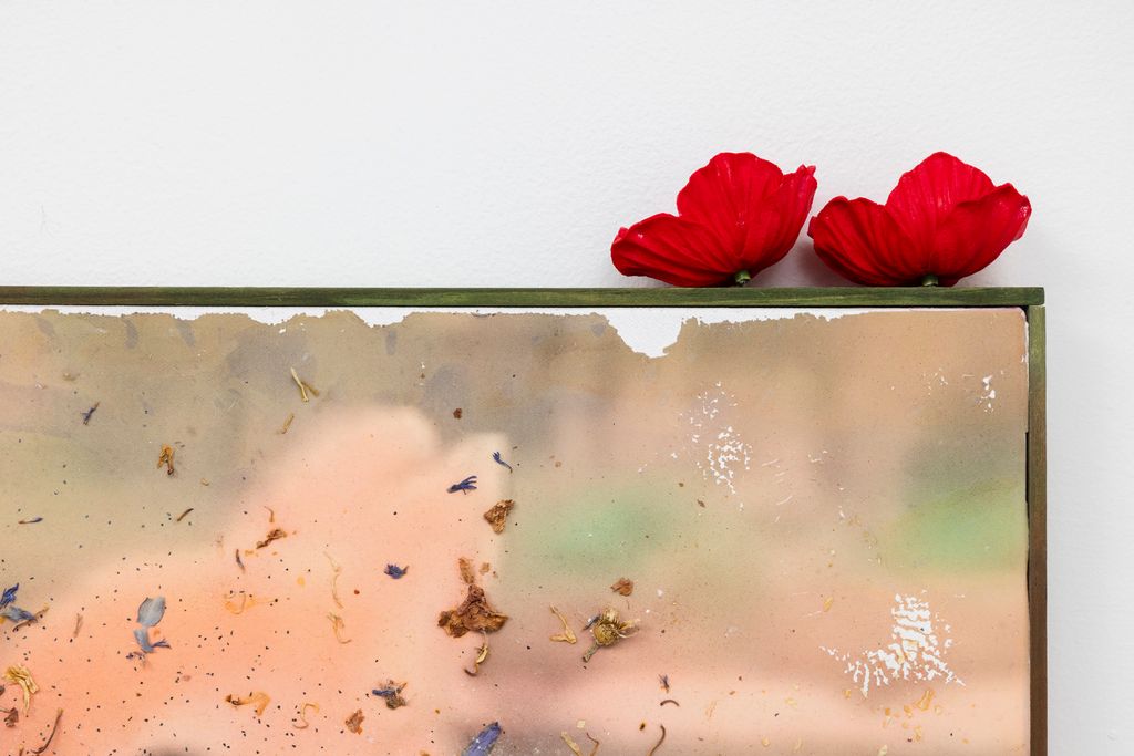 Toner powder, acrylic medium, paper, dried flowers on canvas, silk flowers on acrylic stained artist’s frame