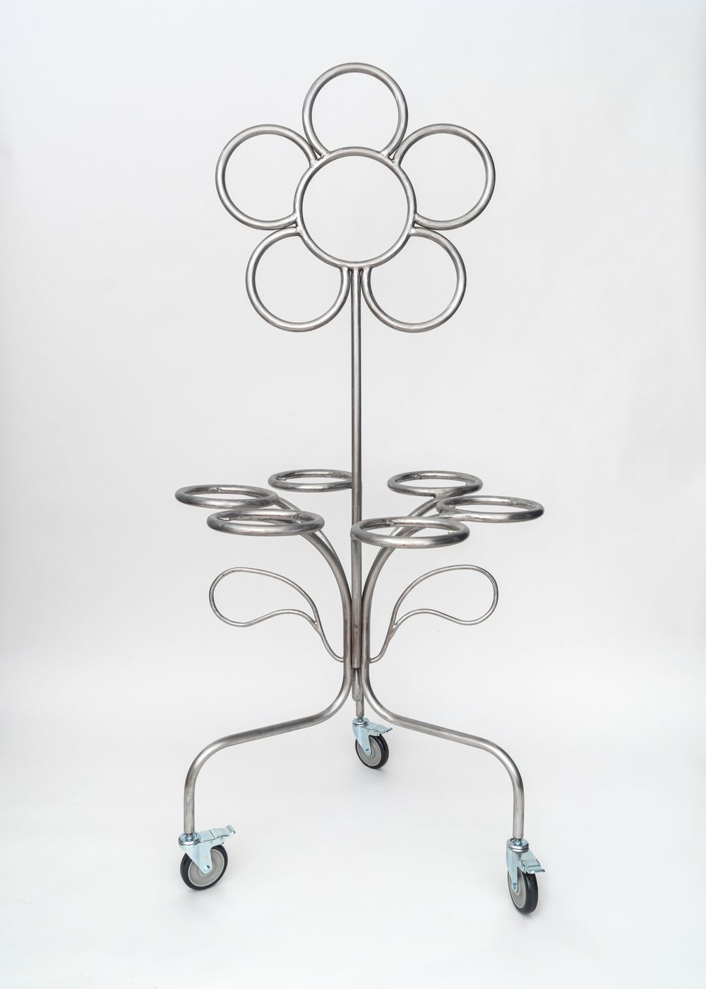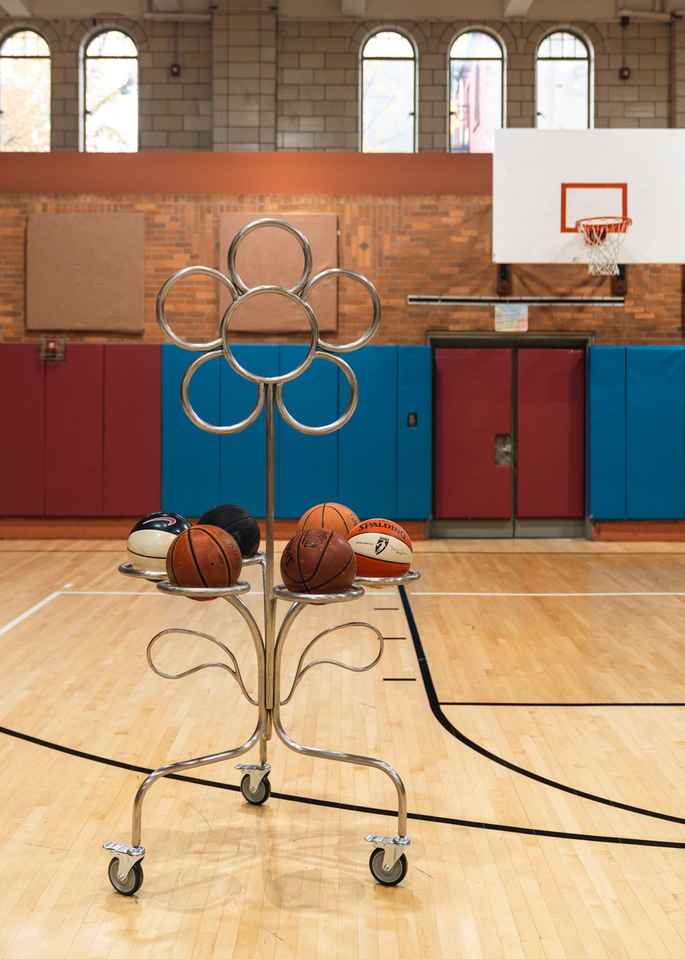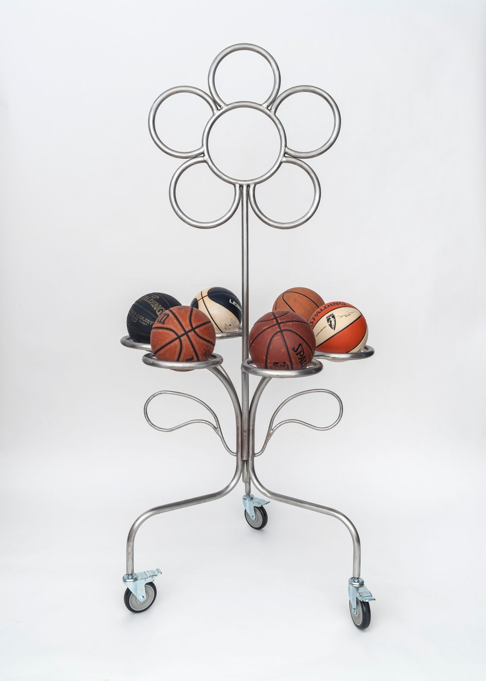 A new sculptural work anchors the booth: a reimagined basketball rack fabricated from polished stainless-steel tubing. Holding six balls and culminating in a stylized flower—a form seen across Bergart’s work—the piece operates both as display and sculptural intervention, reframing athletic equipment as an object of aesthetic consideration.