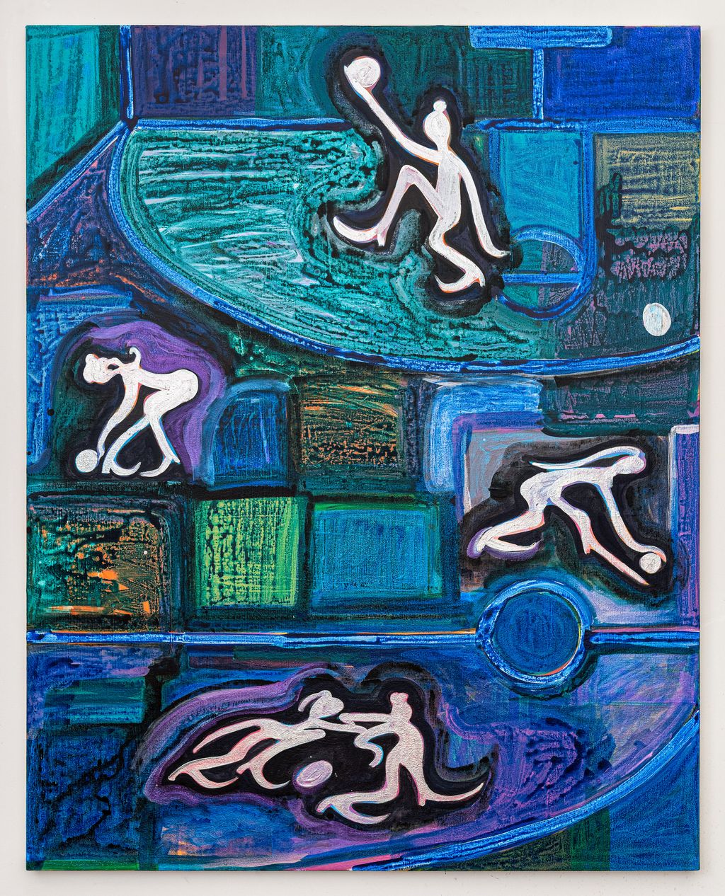 Bergart’s visual language is informed by popular culture, art history, feminist theory, textile traditions—researched during her Fulbright Scholarship in Ghana—as well as her own experience as an athlete. Her paintings and drawings are defined by saturated color and layered, speckled surfaces developed through a controlled yet intuitive process. Works on view articulate two primary modes: geometric abstractions that echo the lines and spatial logic of courts and athletic fields, and patterned grounds animated by silhouettes of women athletes. Rejecting hierarchy and illusionistic depth, Bergart composes open, charged images that reflect the agency, rhythm, and exuberance of play.