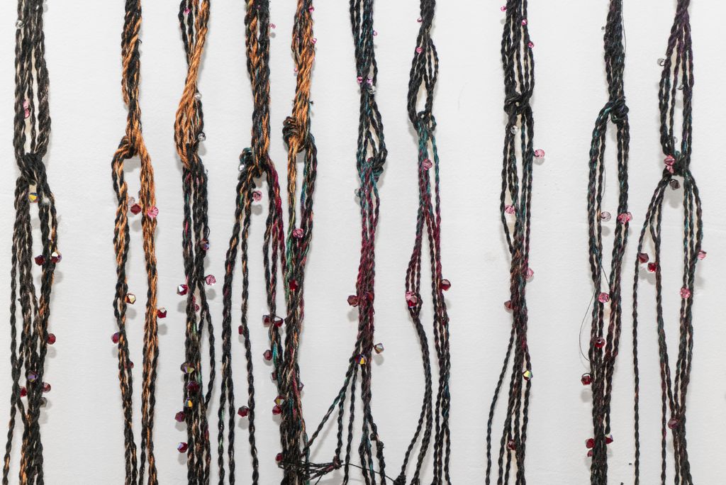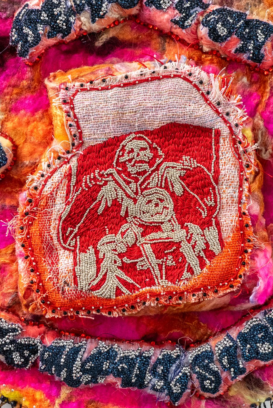 Handwoven fabrics, cotton, wool, silk, bleach rhinestones, beads