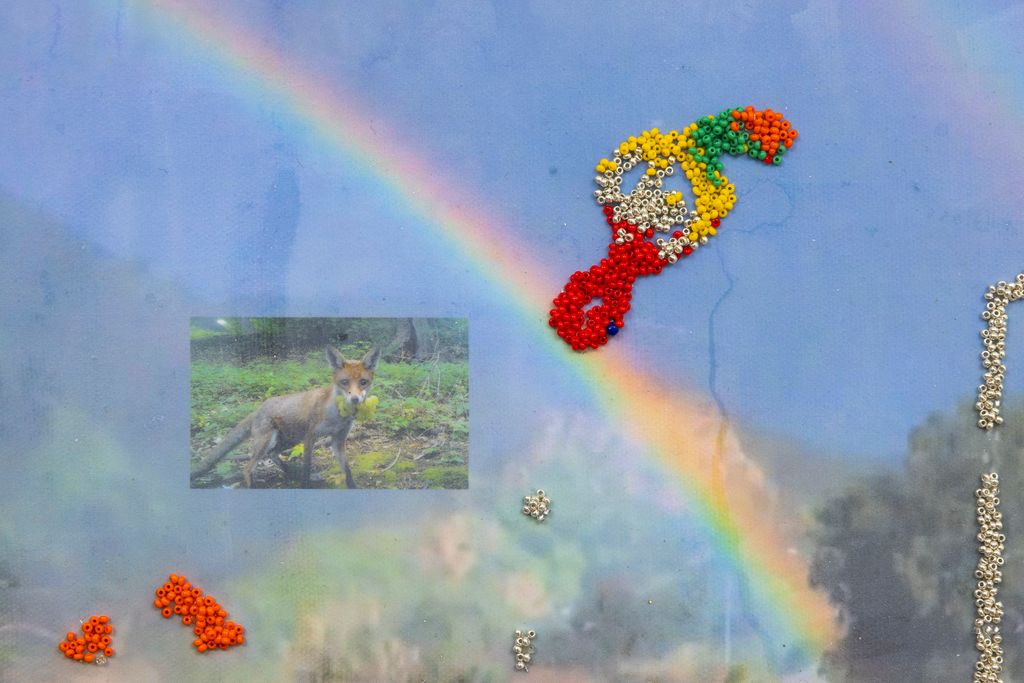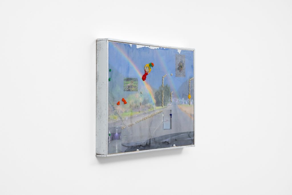Toner powder, acrylic medium, paper, aluminum leaf, adhesive, glass seed beads on gessoed canvas in aluminum leaf artist’s frame