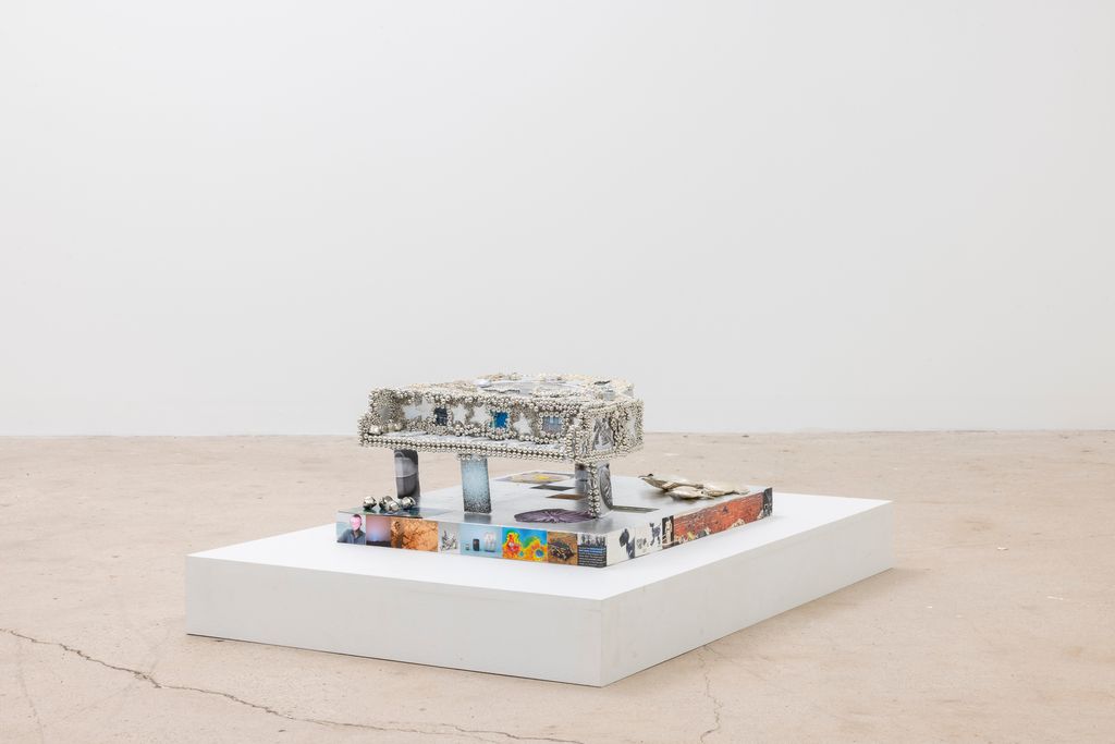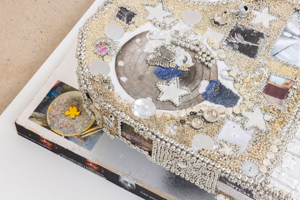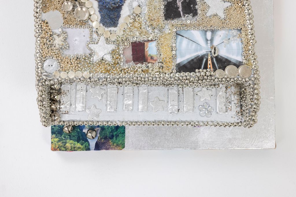 Cardboard, foil duct tape, duct tape, house paint, wood, acrylic medium, hot glue, aluminum, alumi- num foil, copper lear, genuine silver leaf, nail polish, glitter, copper, DG Jamaican Kola Champagne Flavored Soda cap, ink on cotton, ink on paper, ArtForum art ad, miniature pots and pan, artificial tears, tap water, blessed water, magic, artificial pearls, glass beads, glass seed beads, plastic cowrie beads, plastic beads, butterfly pendant, rhinestones, found material, stickers, miniature watering can, silver bells, paint marker, metal paint, lambskin leather and wool thread