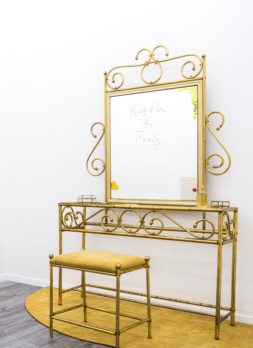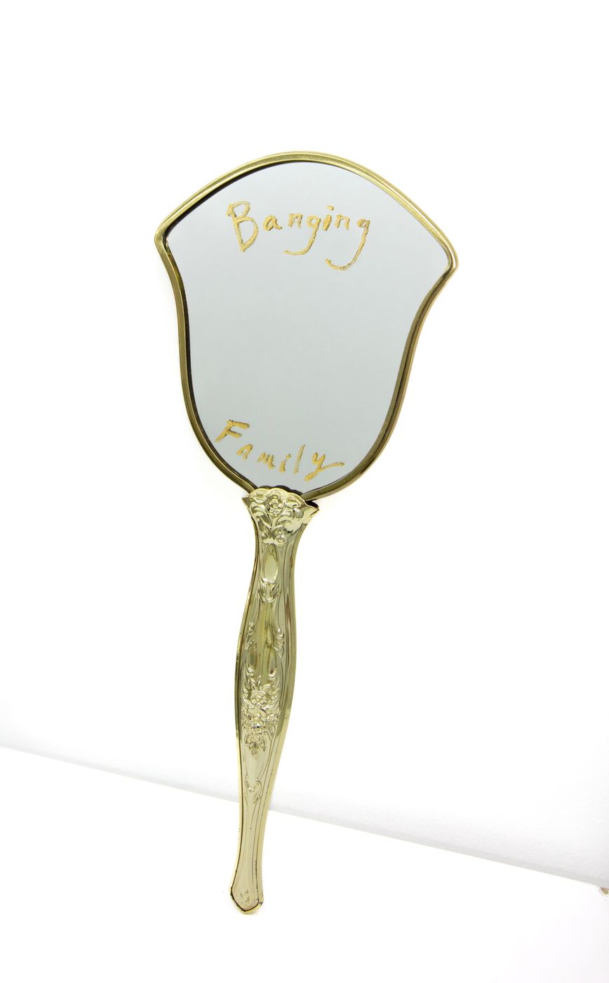 24k gold, hand engraving on found mirror, deadstock Diesel men's cologne, gold rug, and ephemera from the artist