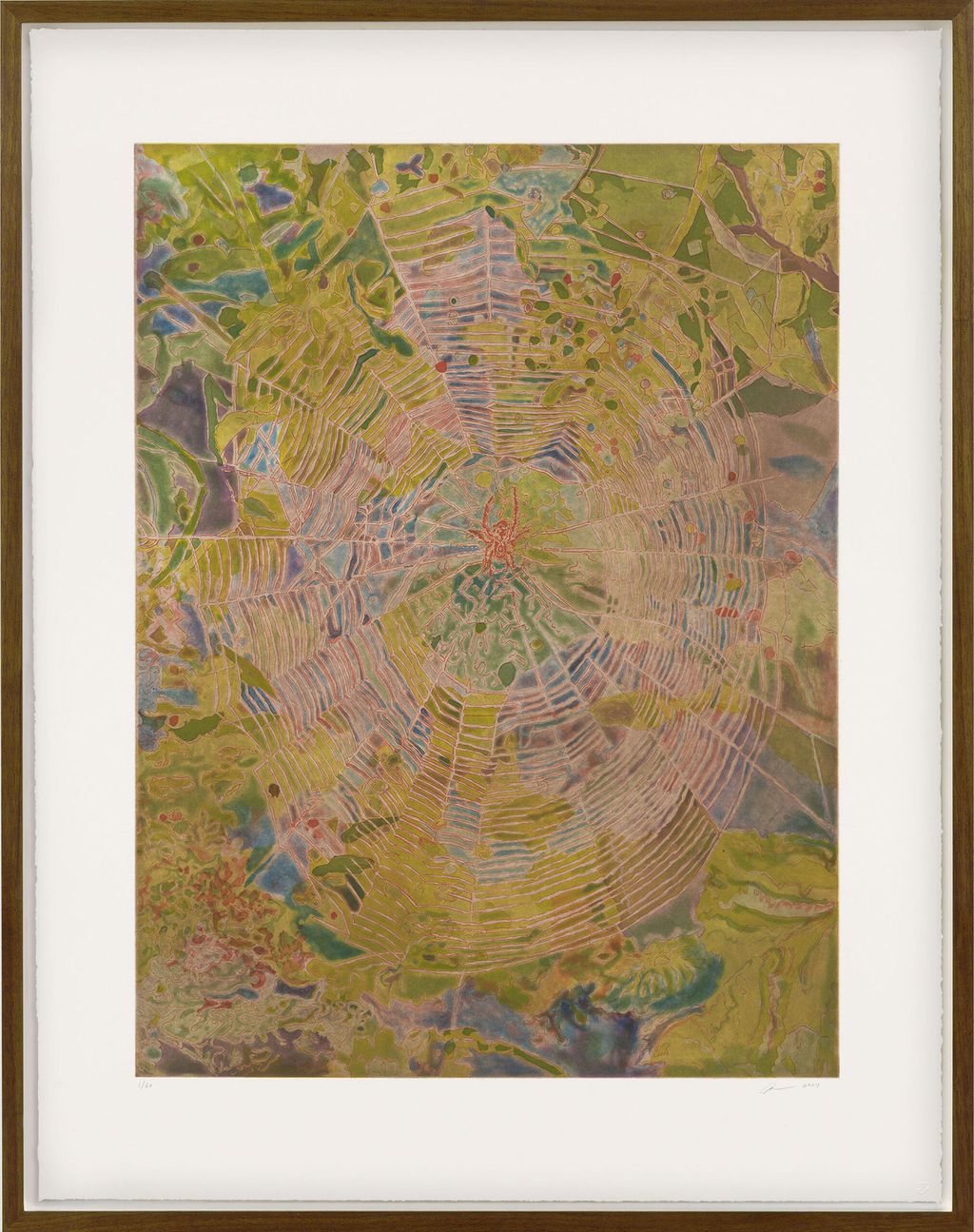 Wingate Studio is pleased to present Orb Weaver, Late Summer a new six plate aquatint etching created with Hayley Barker in the summer of 2024. This large-scale etching by Los Angeles–based artist, depicts the orb weaver spider, a subject she explored in paintings based on her parents’ backyard in Oregon.