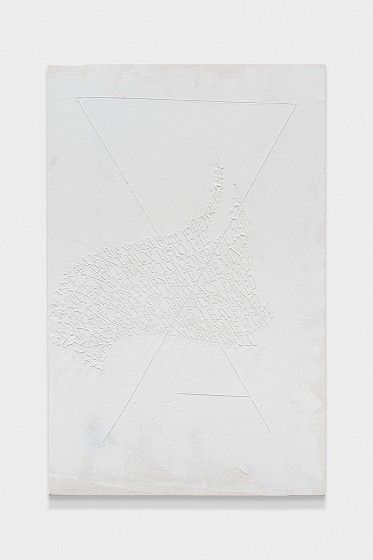 The "Monotony of the Pattern Recognizer" series of 2021 - machine embroidery, algorithmic text, acrylic on canvases - extends Zhilyaev’s use of white monochromes to question institutions and frame white as action and renewal.