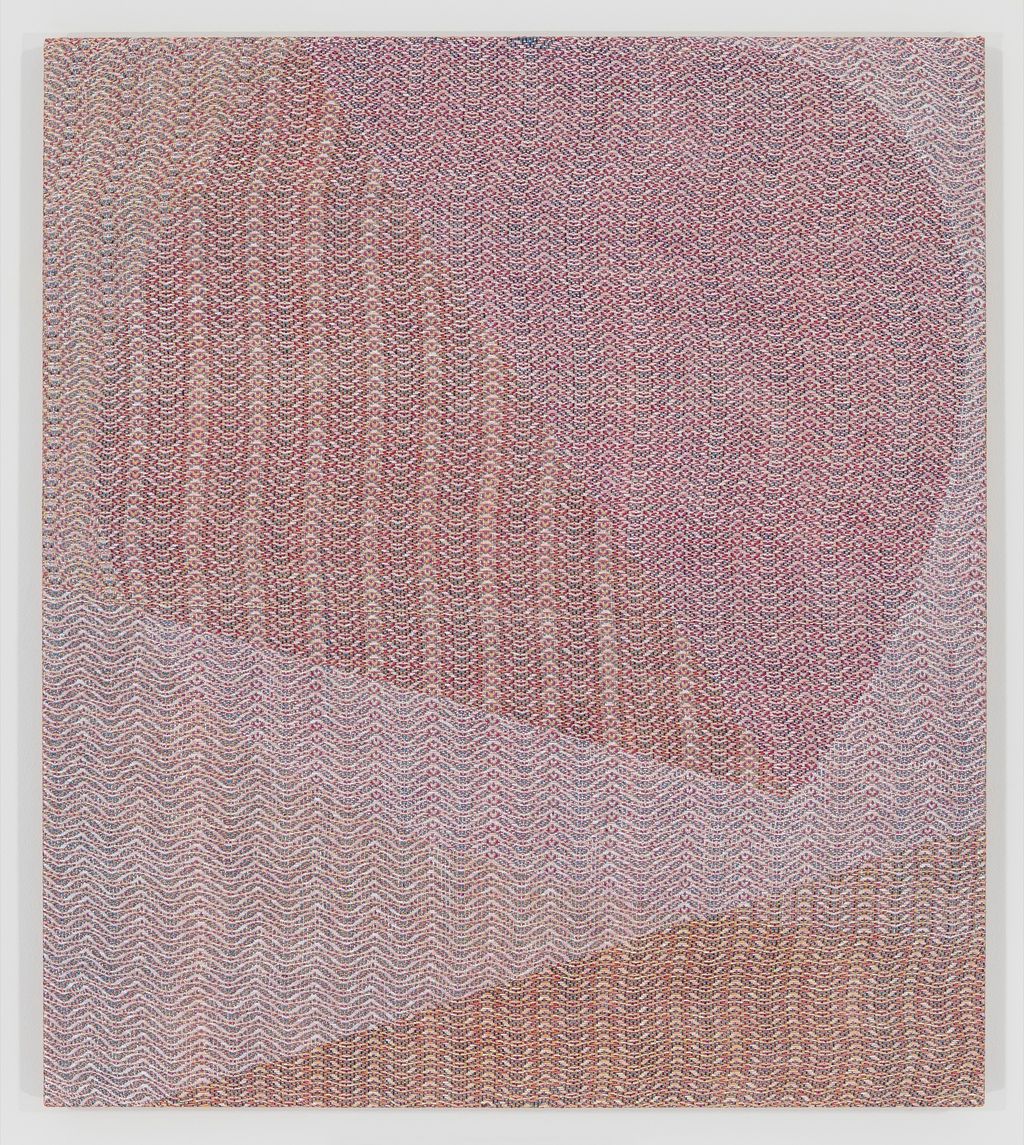 Barrow Parke’s collaborative practice explores weaving as both process and visual system. Their intricate paintings on handwoven fabric merge painted surface with the material’s inherent color, texture, and pattern. In the work on view, they align the Cartesian logic of weaving with the CMYK color model of commercial printing—using white paint to offset thread