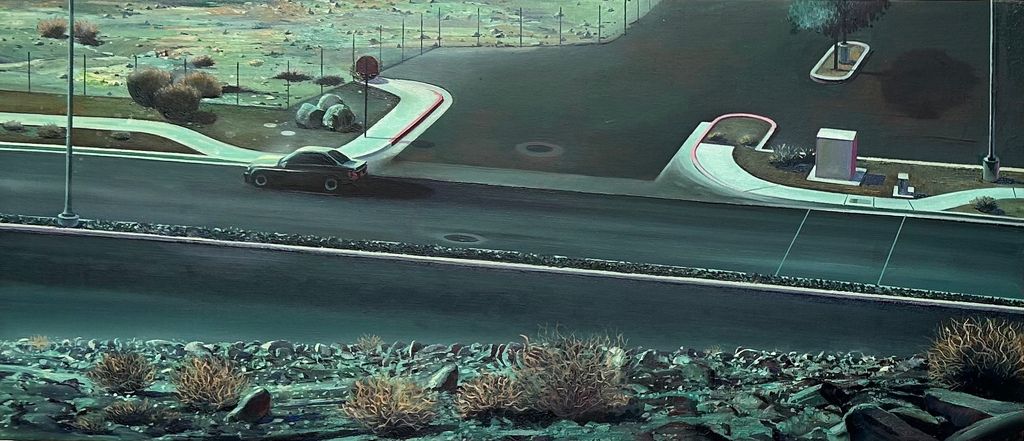 From this aerial remove, the parking lot's mint-colored islands and their ornamental plantings feel like a verdict on human presence in the desert. One car traces the looping path while scrubland presses in from below, desiccated and patient, and Diehl holds the tension between these realms without resolution—just the flat documentation of how we arrange ourselves in hostile territory.