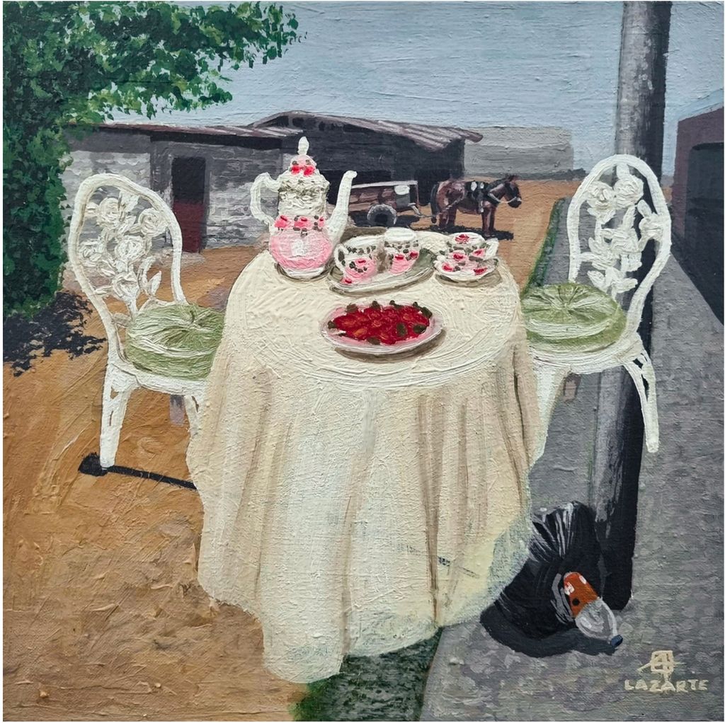 Above it—and in an attempt to cover the first image—a dreamlike scene of European tea tables emerges. This fantasy is painted in oil, further emphasizing the tension between these two contrasting worlds.