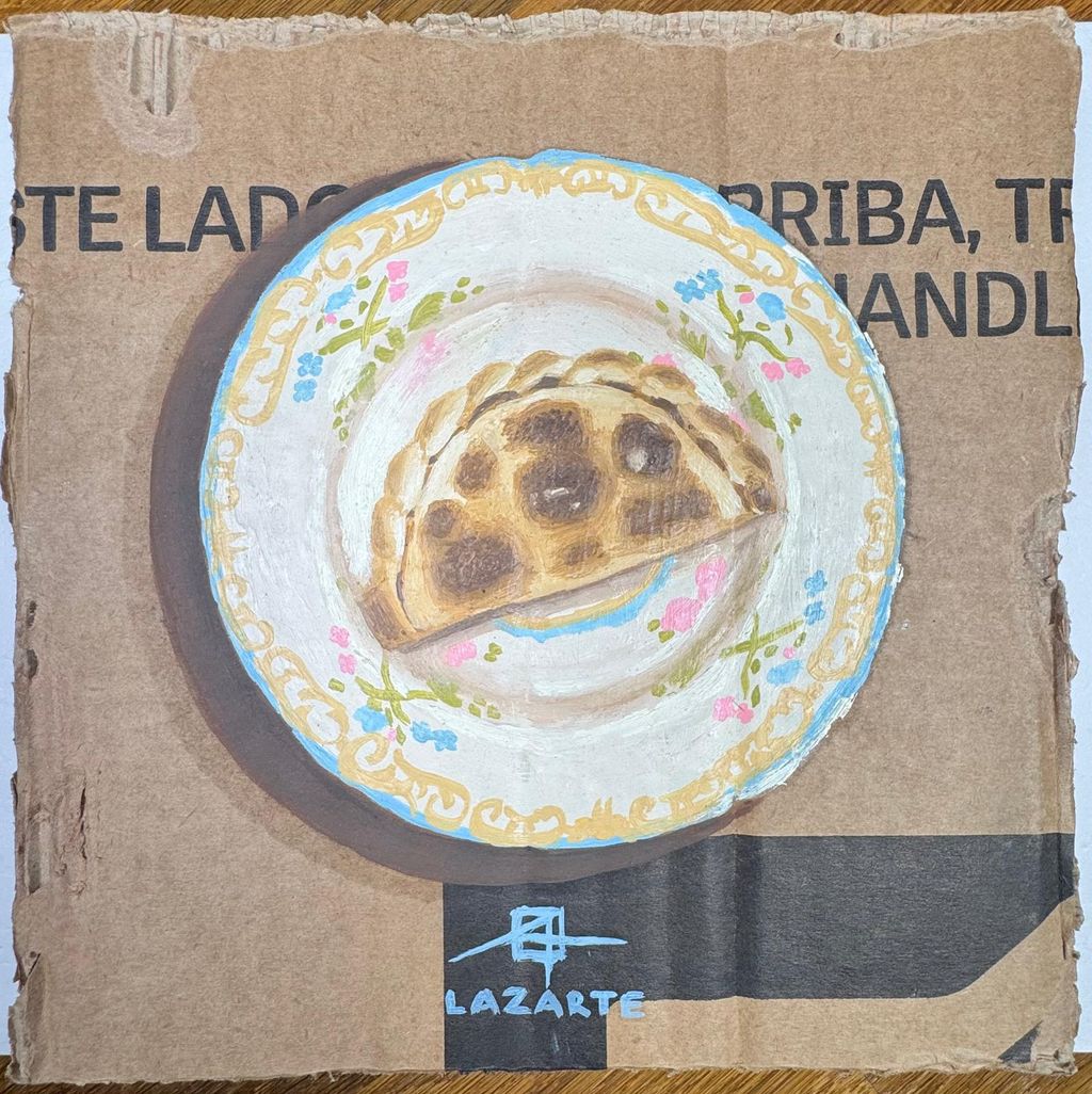 “Dîner chez Gaby” captures the moment just before eating an empanada, a simple gesture deeply tied to the artist’s Tucumán identity. The work brings symbolic tension into play: an empanada served on a European-style ceramic plate contrasts with the precariousness of the support, creating a dialogue between the aspirational and the real.