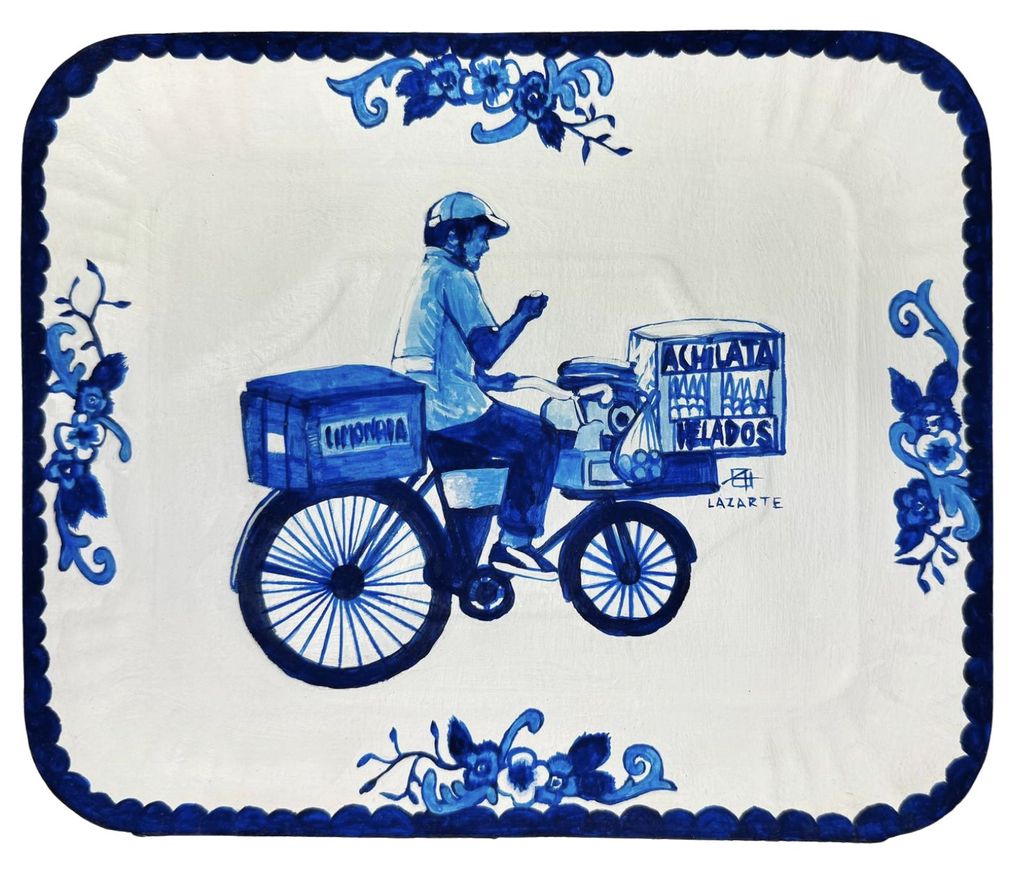 lateau II creates a tension between an everyday scene—a routine shopping trip to the artist’s local market—and the refined aesthetic of European ceramic painting. The work serves as an homage to precarious laborers, bringing their presence into the symbolic realm of artisanal luxury. By reproducing this visual language on a humble support, the artist challenges material and cultural hierarchies, elevating the dignity of daily life through a pictorial gesture that highlights what is often overlooked.