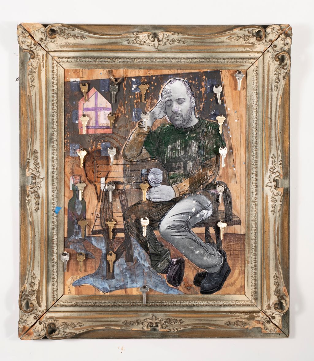Acrylic image transfer, stencil litho ink monotype, her, the spill, screws, duty, contemplation, collage, stars, found keys, key board, plywood, many years of service parking cars, color pencil on found wood panel