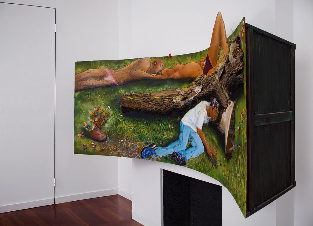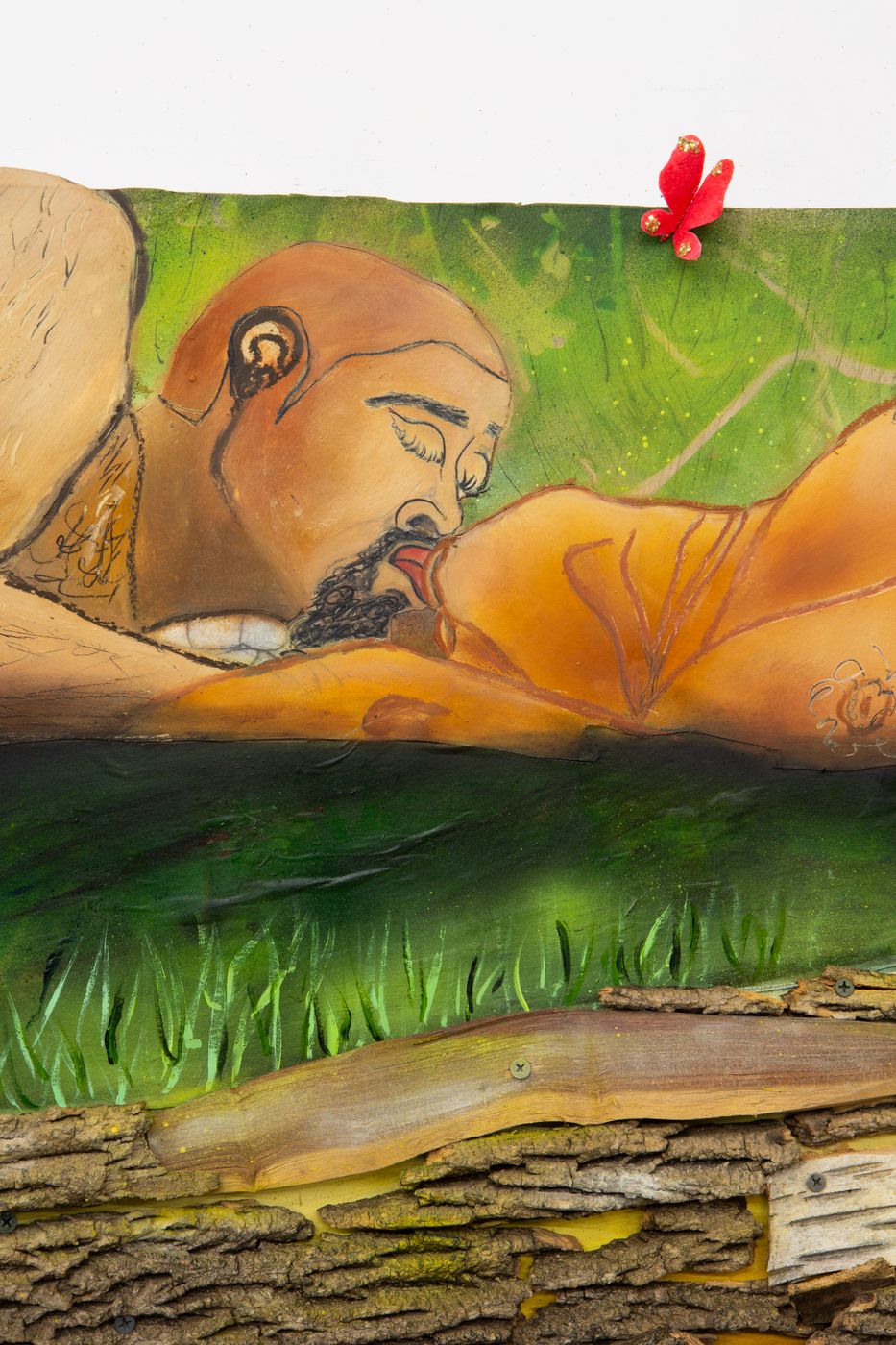 Oil, acrylic, watercolor, oil stick, oil pastel, spray paint, miniature bottle caps, lemongrass, thread, yarn, tree bark, whispers, color pencil, pastel, cinnamon bark, crayon confetti, resin, her immortalized flowers, pencil shavings, high grass drips, ink, collage, flowers, plywood, wood stain, Marcus Garvey Park, immersion, graphite, puzzle pieces, beads, fig leaf, metal wire, echoes, dried acrylic and oil mediums, matchsticks, flutters on paper on Euca board on wood on wall