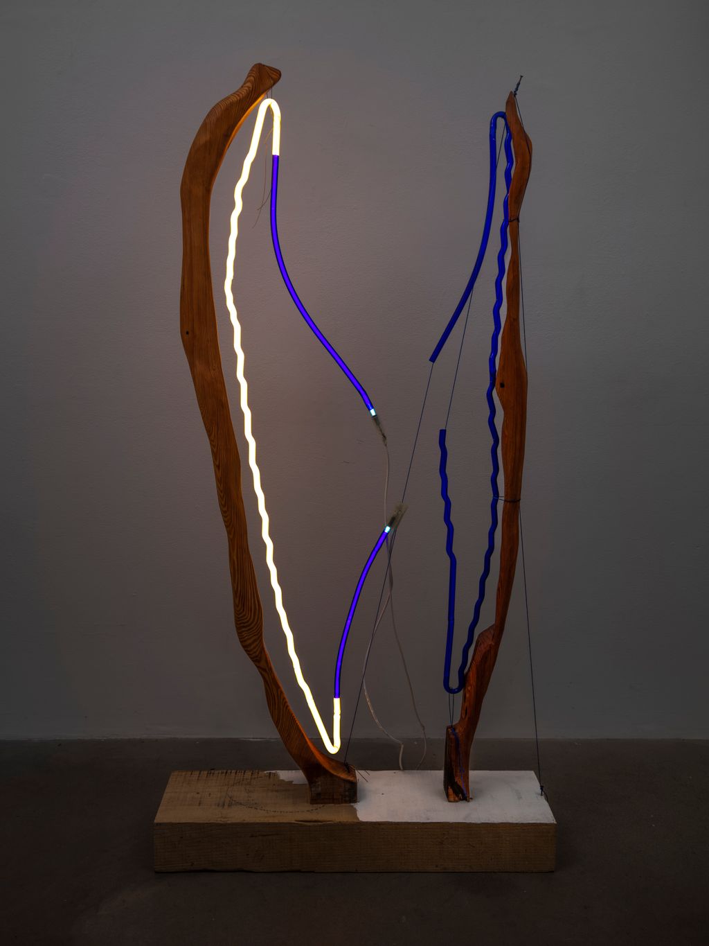 Mariko Makino, Blue Shadow, 2025Reclaimed long leaf pine, neon tubing, glass, string50 × 30 × 8 inches