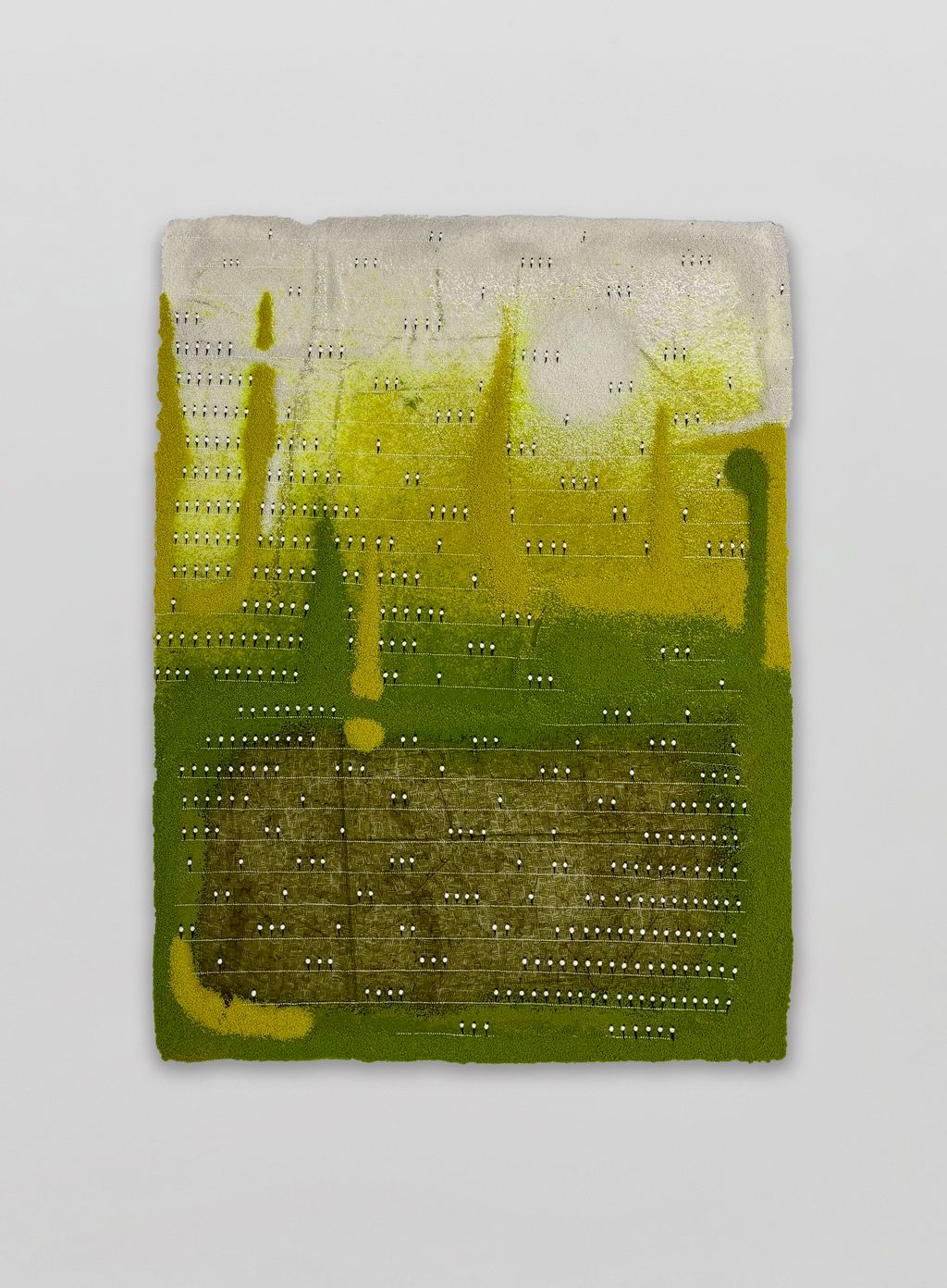 and resin. These surfaces are punctuated by acrylic whose arrangements echo crop spacing, irrigation patterns, and seasonal erosion. Each dot becomes a precise record of agricultural memory, foregrounding women’s often-overlooked