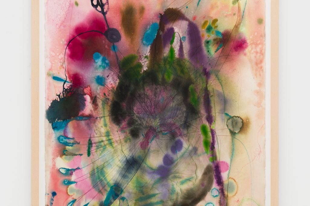 In She Chooses Her Portrait, 2025, a pale, luminous field stages the act of self-selection. A faint central form hovers like a face in decision, surrounded by drifting blue and pink filaments that suggest competing versions of the self. Park positions identity as a mutable gesture rather than a stable outline, allowing the viewer to witness the pause before a choice is made.