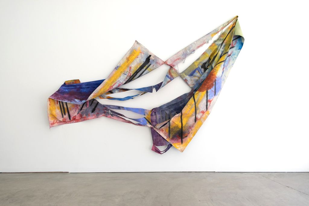 Vaughn Davis Jr., 'Unrhythmic', 2019. Unprimed canvas, acrylic, dye, pigment aerosol. 96 × 130 × 4 inches. Presented by Dimensions Variable, Miami.