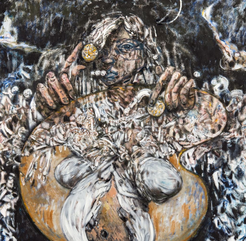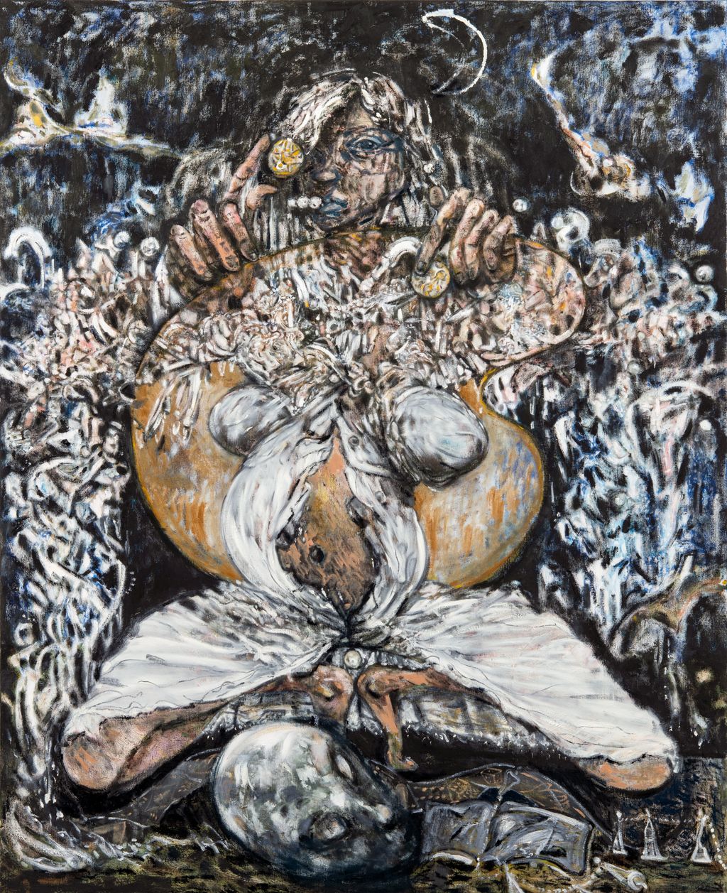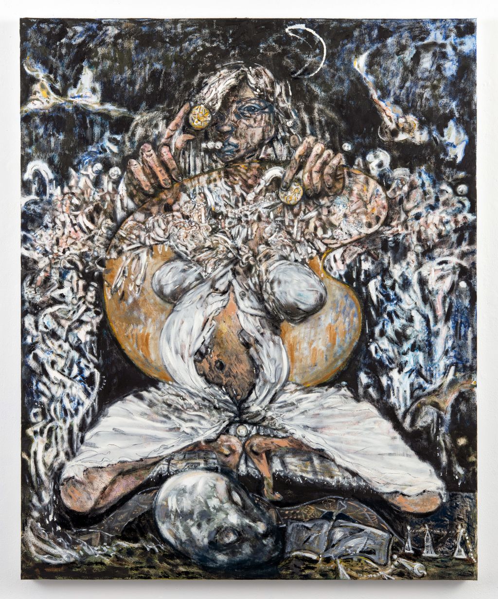 "Our bodies have been painted from palettes held up against our faces for years as we sat still, being studied. Yet we paint from our own bodies, and our body is the palette, for it is life we paint with. When I carried my child, I felt my genetics change. Her history is part of my cellular history now, and the white embellished rags come from Danish embroidery, from her grandmother, who was my daughter’s age when the Germans invaded. Tinkling bells, a mediaeval birthing girdle and Iceni coins coming from Boudicca’s reign, from my island history, from the stories of women who’d face down death for their children, for there is more than one gold to riches."