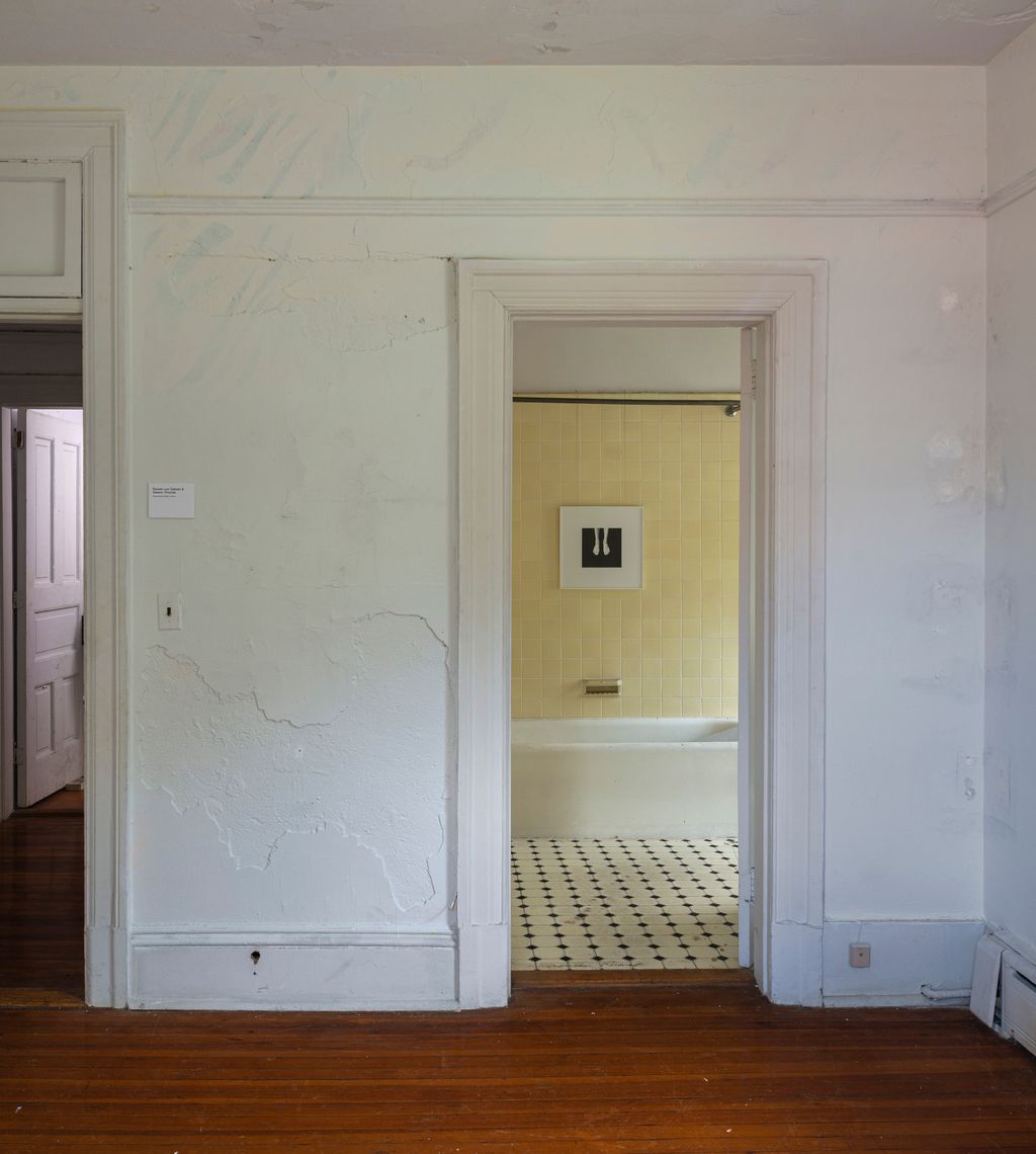 EXILE invited New York-based artist Gwenn Thomas and Vienna-based artist Kerstin von Gabain to respond to this temporal collision and create an immersive stage for their artworks. The selected works were deliberately not installed into but onto the existing space itself with some of the artworks’ material sources left in a state of flux themselves. Exposed to the elements, von Gabain’s soap pieces, shaped after human bone structures and arranged within the bathroom space, will begin to sweat and disintegrate over time. Thomas’s translucent glass shapes, their repetitive form taken from an abandoned found object and displayed in the bedroom’s cupboard, slowly pass the changing light of day. Both works respond to the spaces’ fluctuant nature and honor the opportunity to become short-lived, but active connectors between historical space and present visitor.