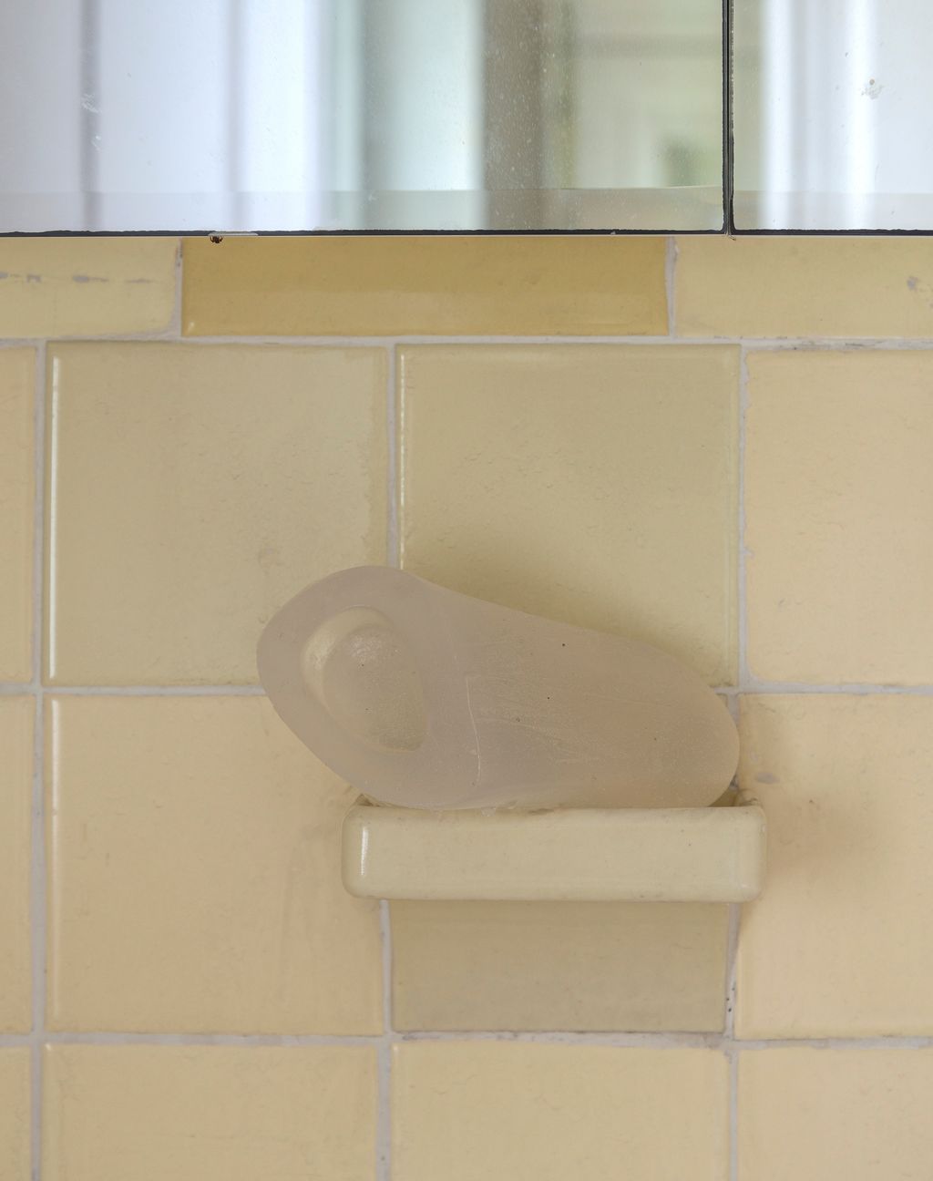 EXILE invited New York-based artist Gwenn Thomas and Vienna-based artist Kerstin von Gabain to respond to this temporal collision and create an immersive stage for their artworks. The selected works were deliberately not installed into but onto the existing space itself with some of the artworks’ material sources left in a state of flux themselves. Exposed to the elements, von Gabain’s soap pieces, shaped after human bone structures and arranged within the bathroom space, will begin to sweat and disintegrate over time. Thomas’s translucent glass shapes, their repetitive form taken from an abandoned found object and displayed in the bedroom’s cupboard, slowly pass the changing light of day. Both works respond to the spaces’ fluctuant nature and honor the opportunity to become short-lived, but active connectors between historical space and present visitor.